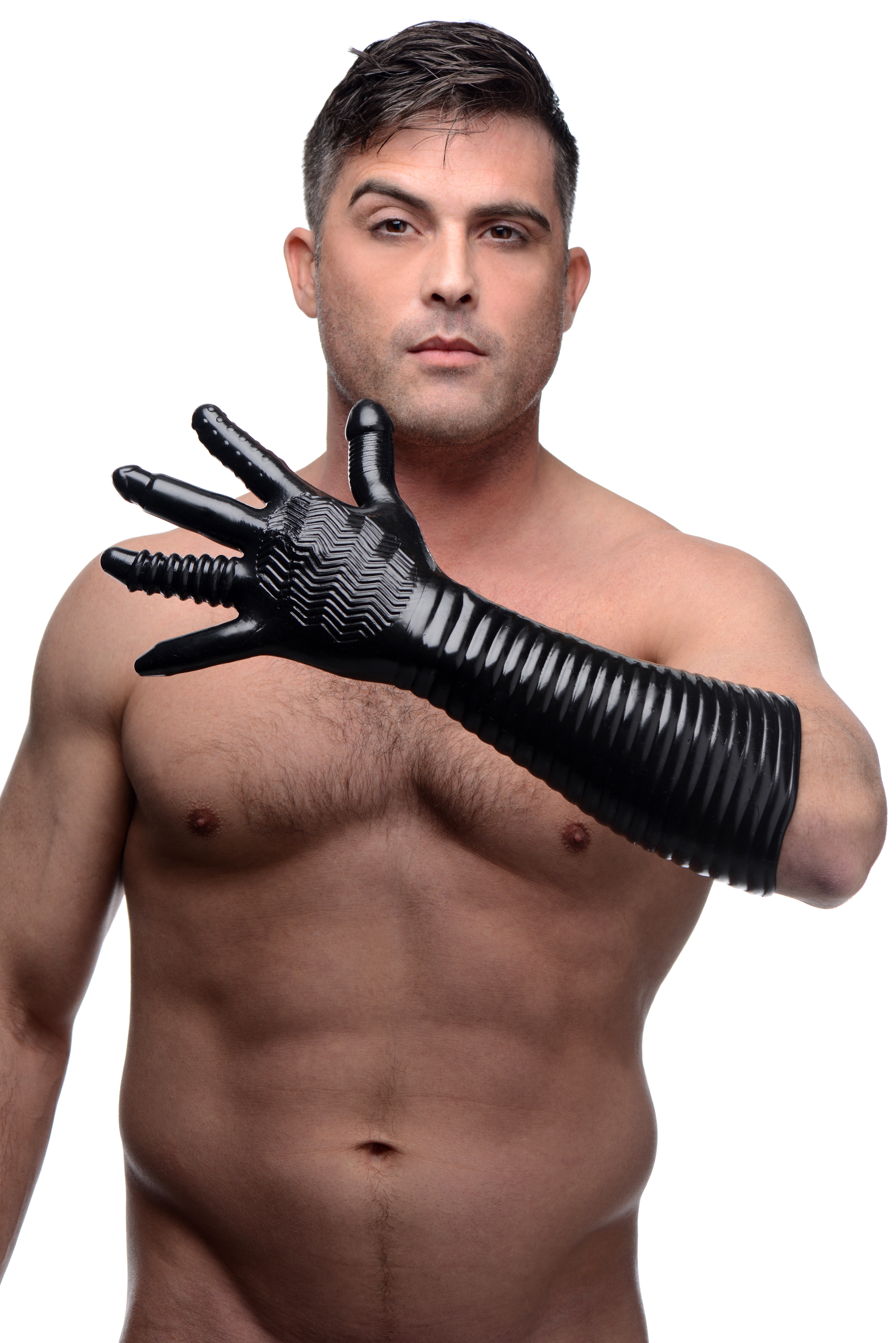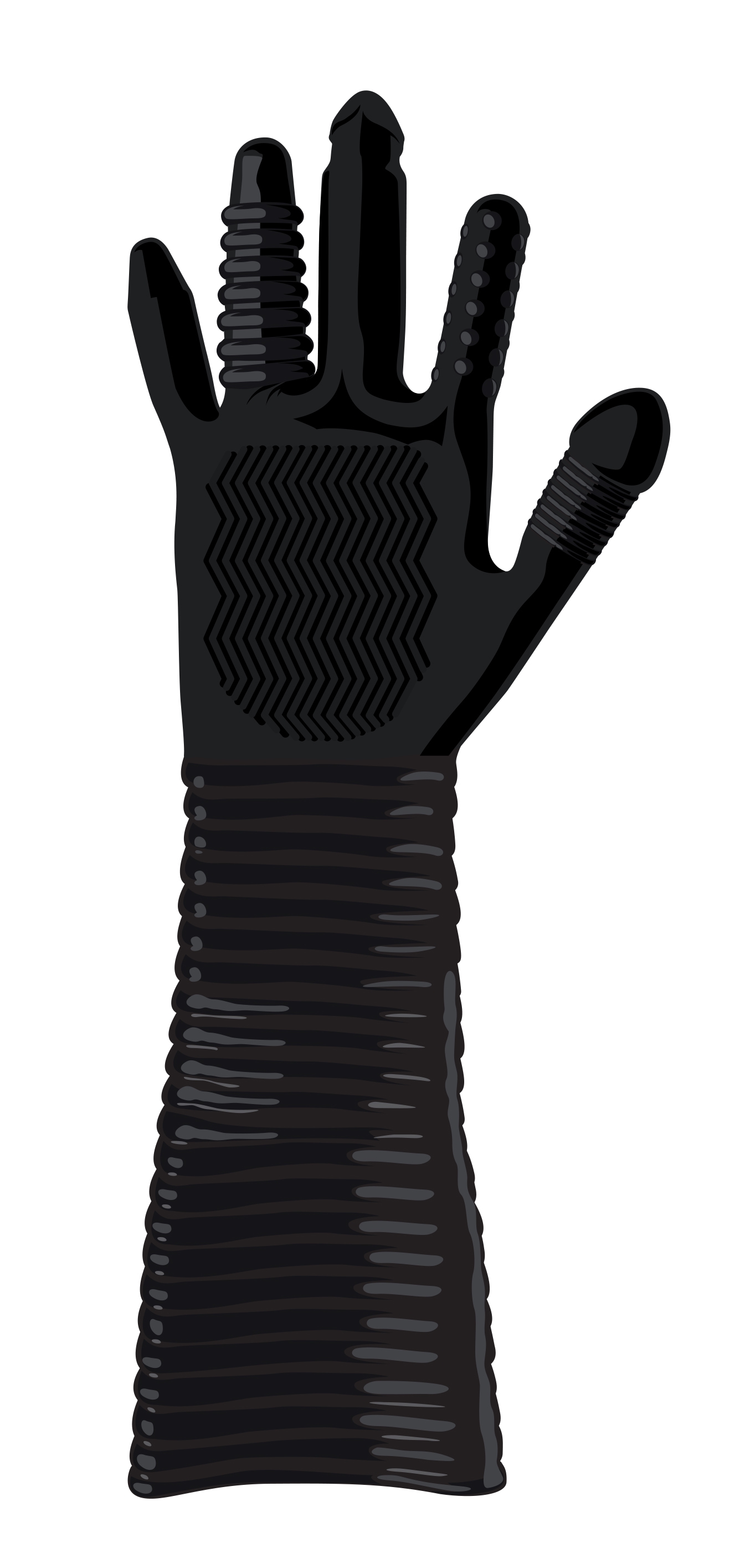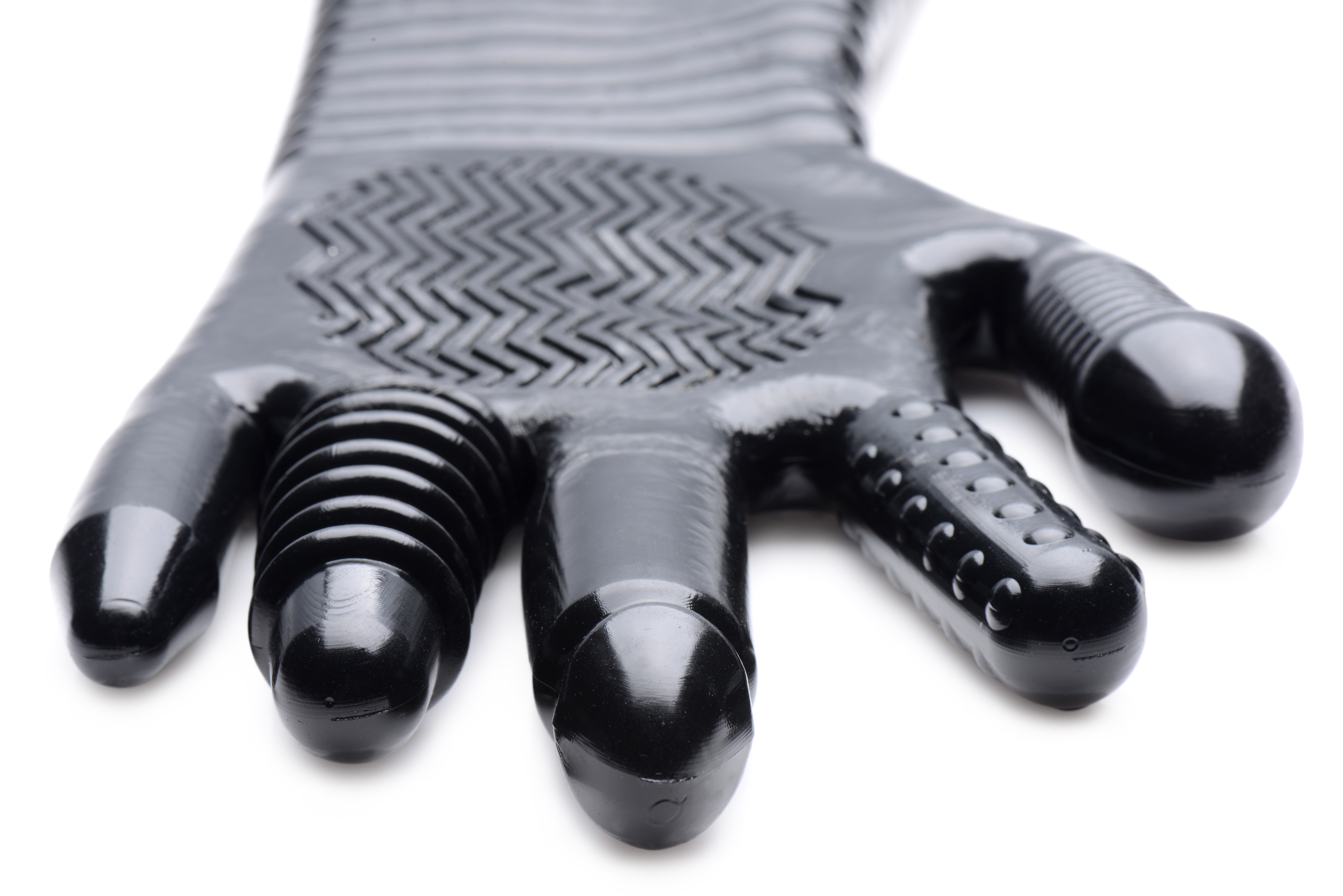 Ce gant long est texturé pour des moments de jeux encore plus excitants.Il est composé d’une surface en zig-zag sur la main et des nervures sur le bras.Chaque doigt possède une texture: lisse, nervurée, forme phallique, avec points bulles et forme de plug. La matière TPR est souple.Appliquer de la fécule de maïs sur la main et bras avant usage