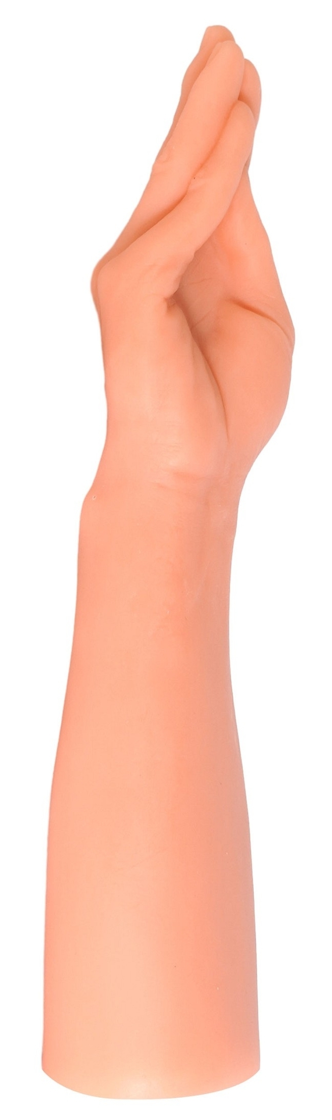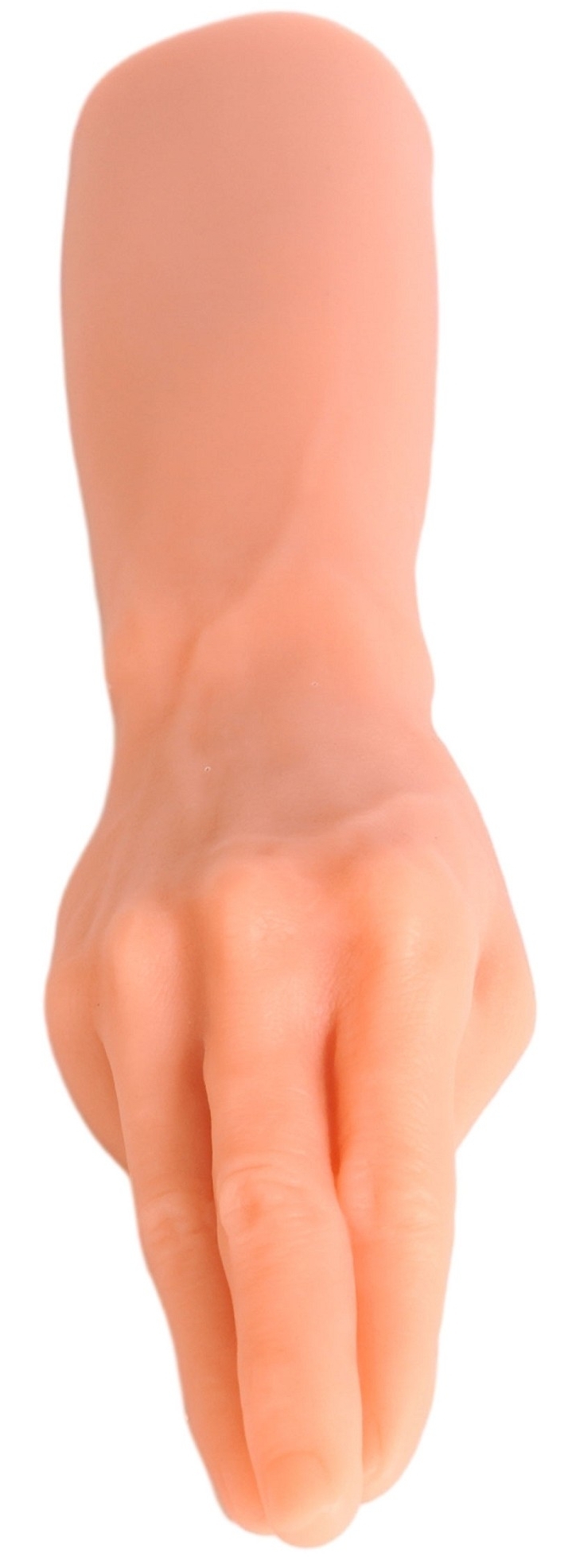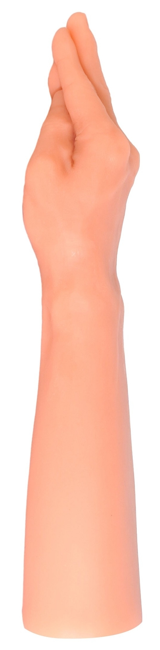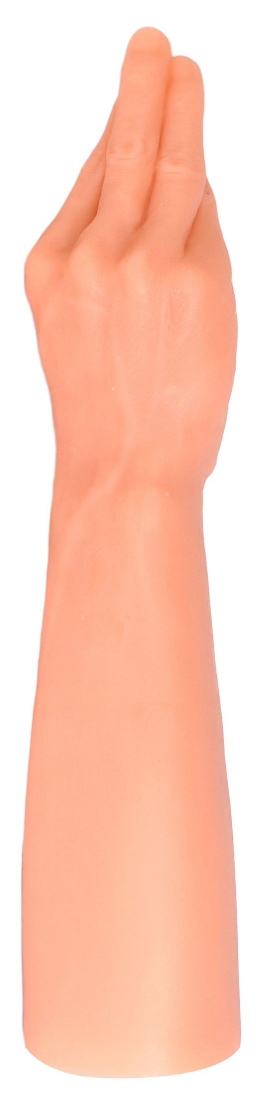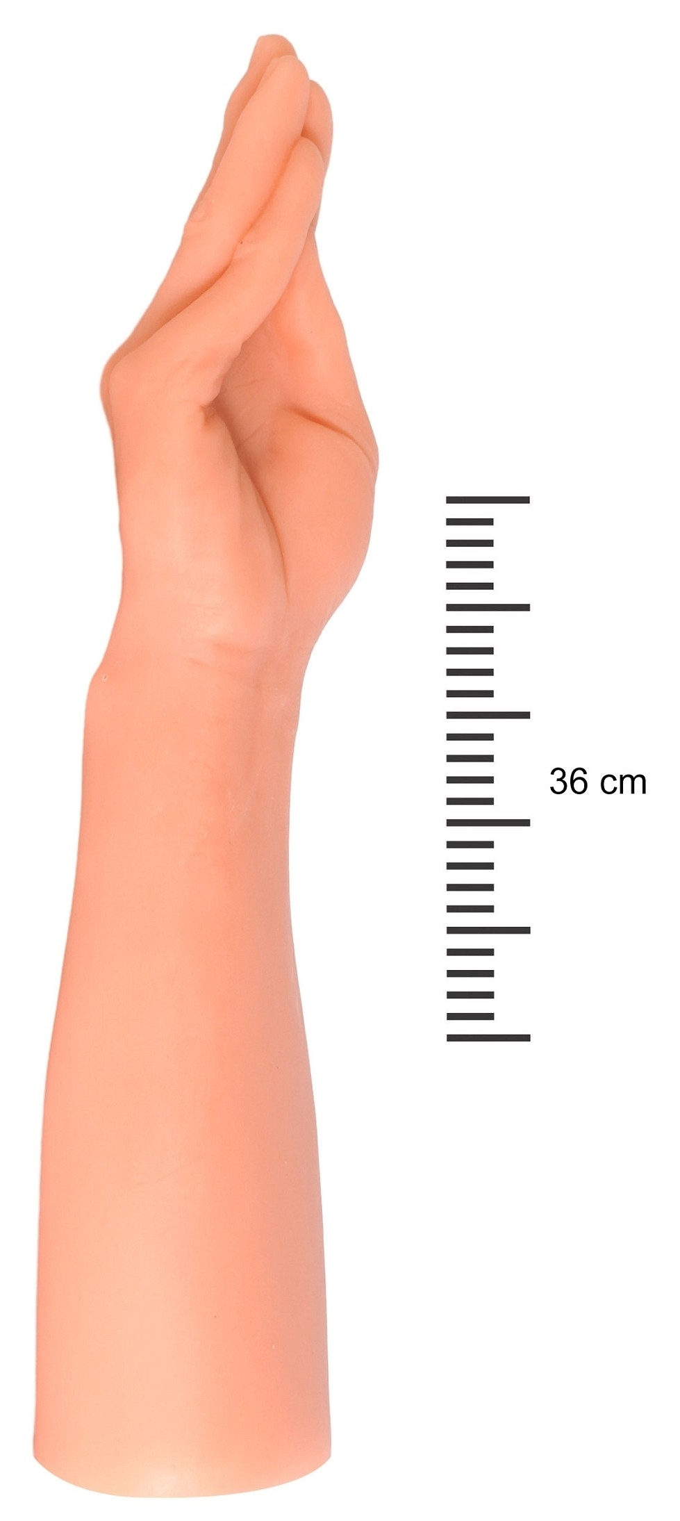 Gode avec une forme de main à l’extrémité.Longueur insérable de 31 cm.Largeur maximale de 7 cm sur la main et largeur de 5 cm au poignet. En PVC