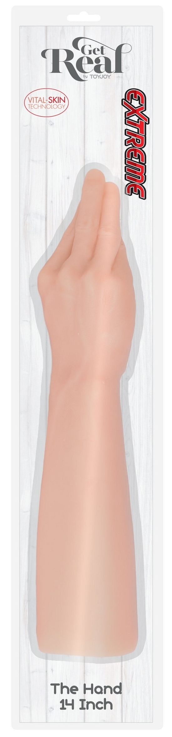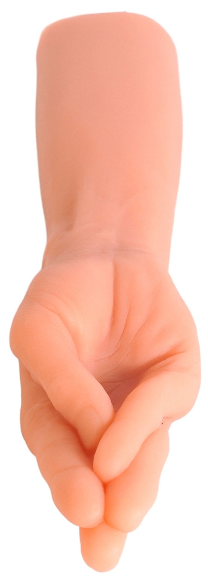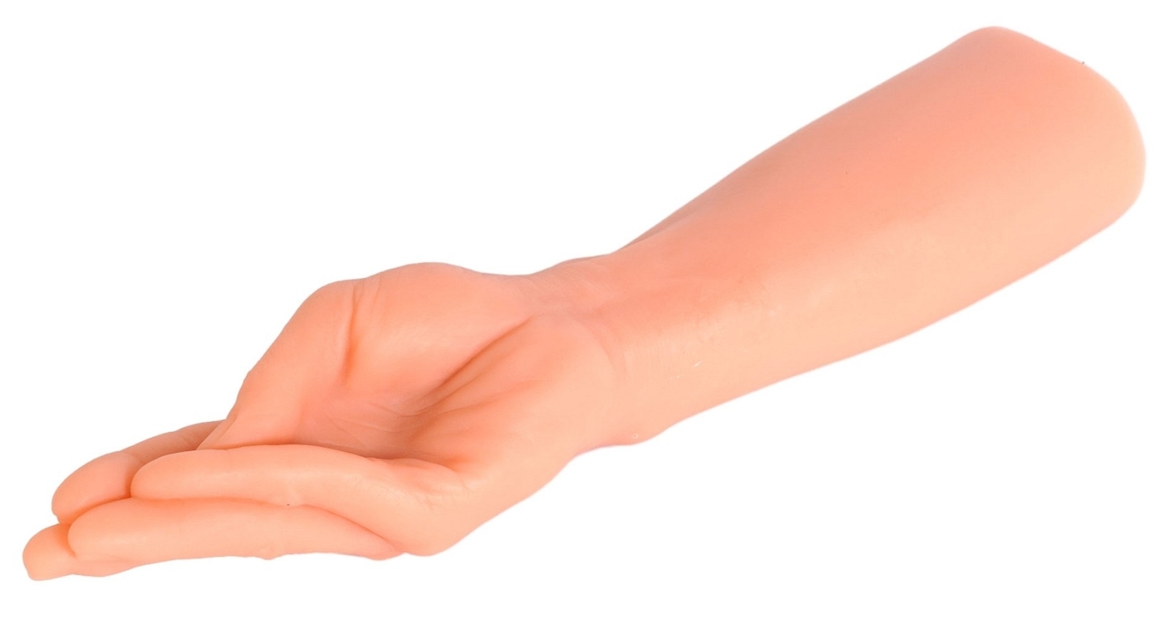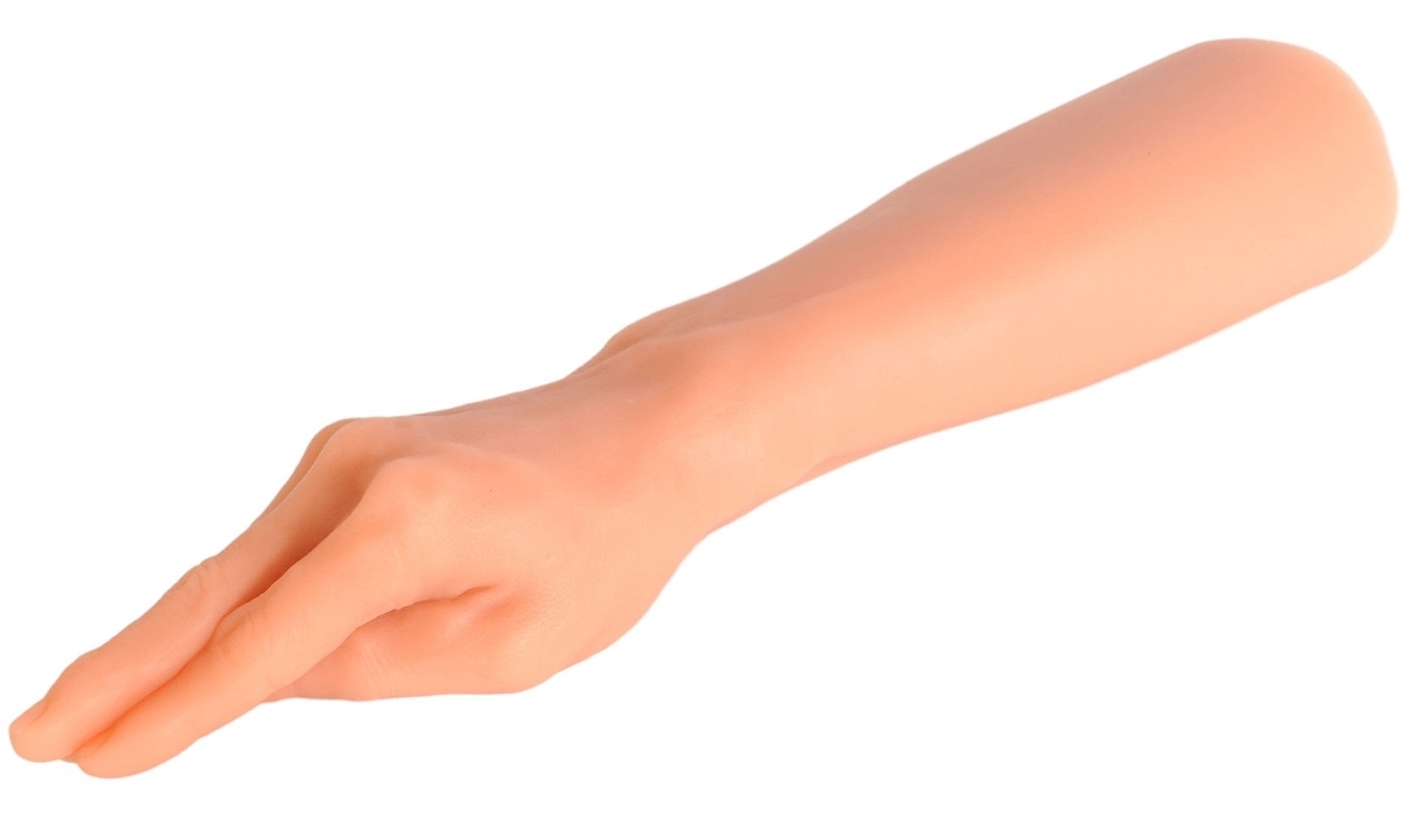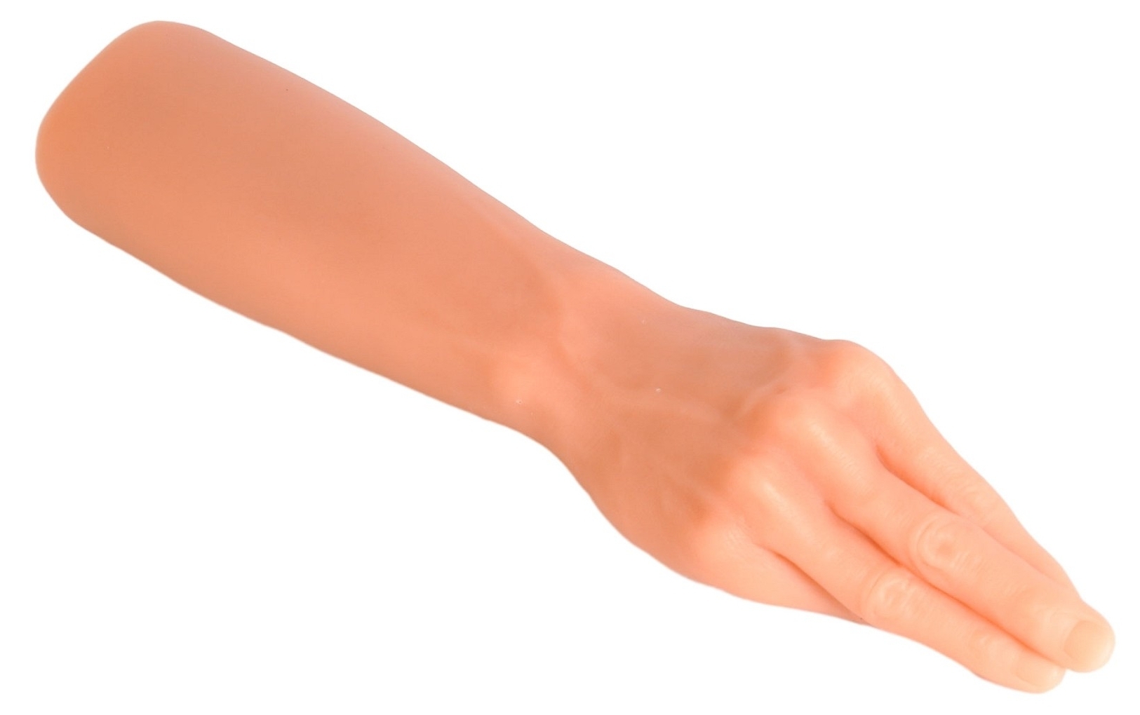 Gode avec une forme de main à l’extrémité.Longueur insérable de 31 cm.Largeur maximale de 7 cm sur la main et largeur de 5 cm au poignet. En PVC