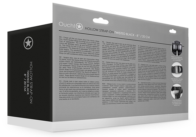 Le gode ceinture creux Hollow Strap Twisted est composé d’une longueur de 19cm et d’une largeur maximale de 3.8cm.La surface a un relief excitant. Avec une sangle ajustable. Les dimensions intérieures sont de 20 x 3cm. En PVC