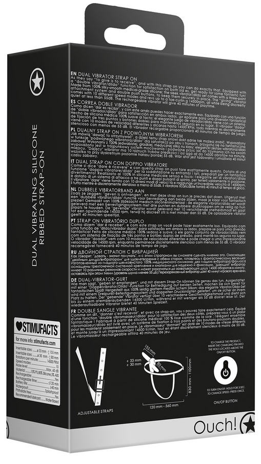 Gode ceinture vibrant avec 10 modes de vibrations (côté externe uniquement). Longueur insérable du gode receveur de 15 cm. Largeur maximale de 3.3 cm. Longueur du gode donneur de 9 cm. Largeur maximale de 3.1 cm. En silicone.Recharge USB