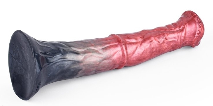 Gode réalisé avec un dégradé de couleurs du Rose au noir avec un effet nacré.En forme de sexe de cheval. Longueur insérable de 27 cm.Largeur allant de 5.3 à 5.5 cm. Base ventouse. En silicone