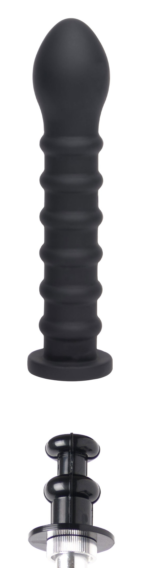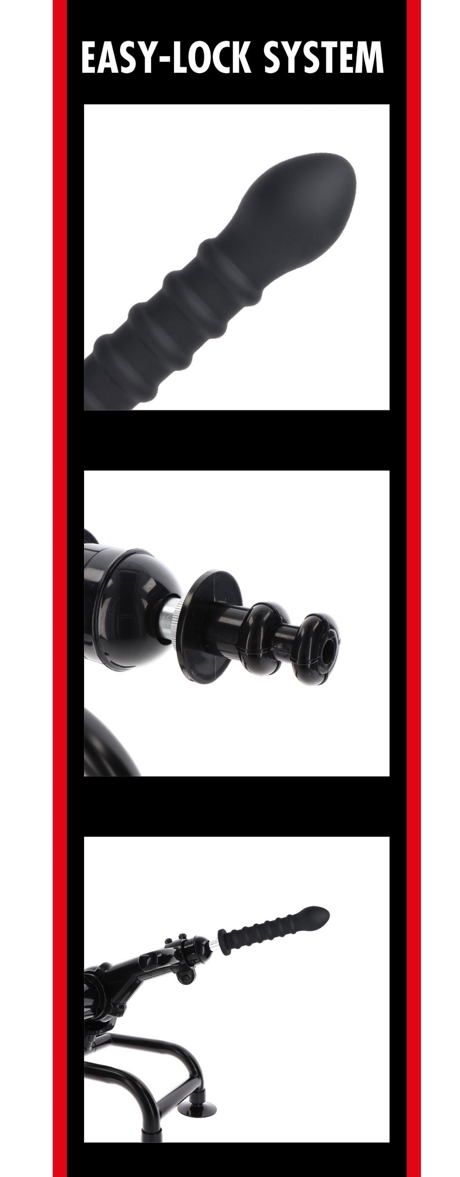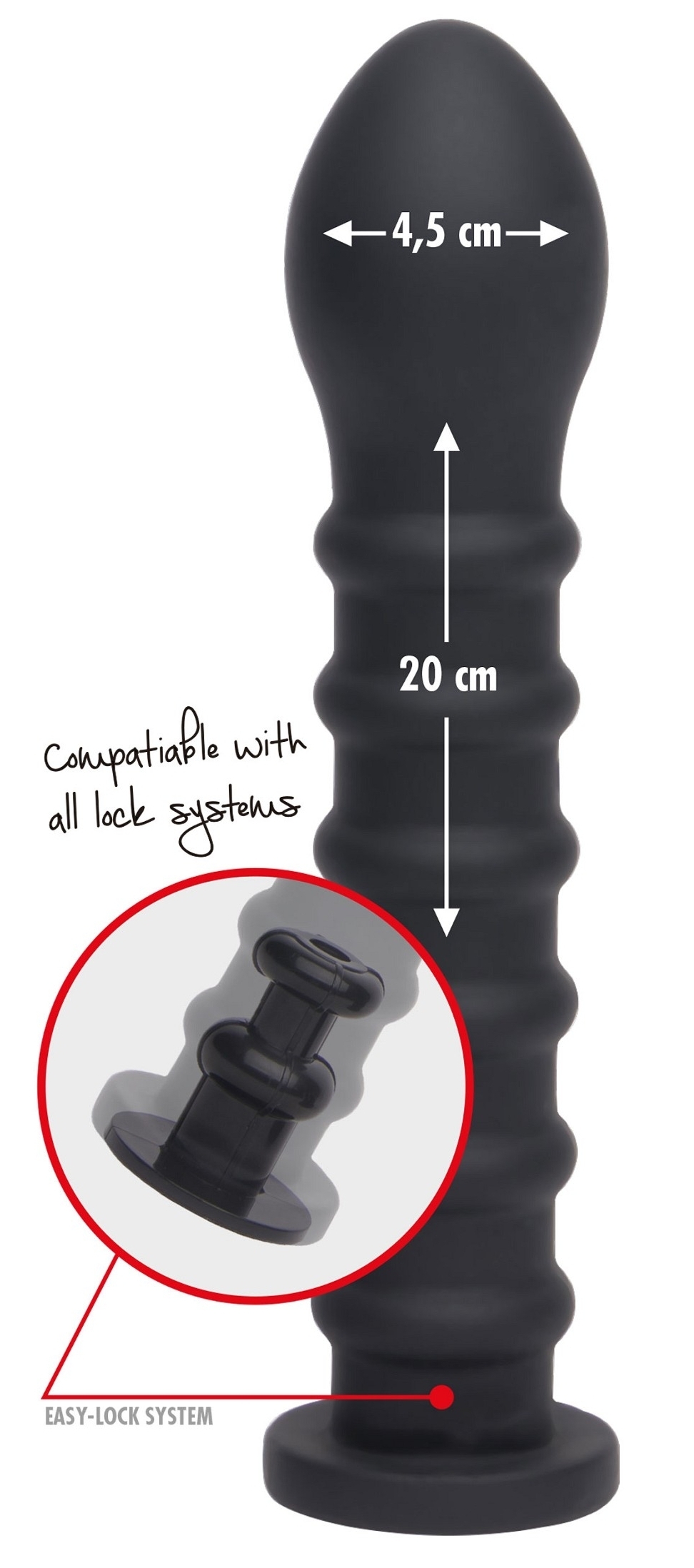 Gode noir Extrémité en forme d’oeuf pour la stimulation du point G Corps avec plusieurs anneaux horizontaux permettant une légère dilatation complémentaire régulière. Compatible avec tous les systèmes Easy-Lock. Longueur insérable de 19 cm. Largeur de 4 cm. En silicone