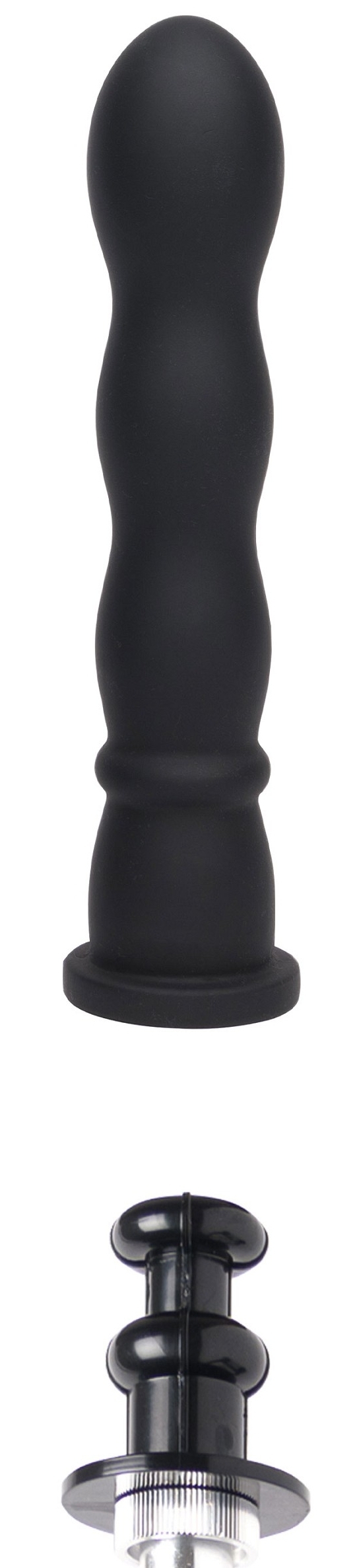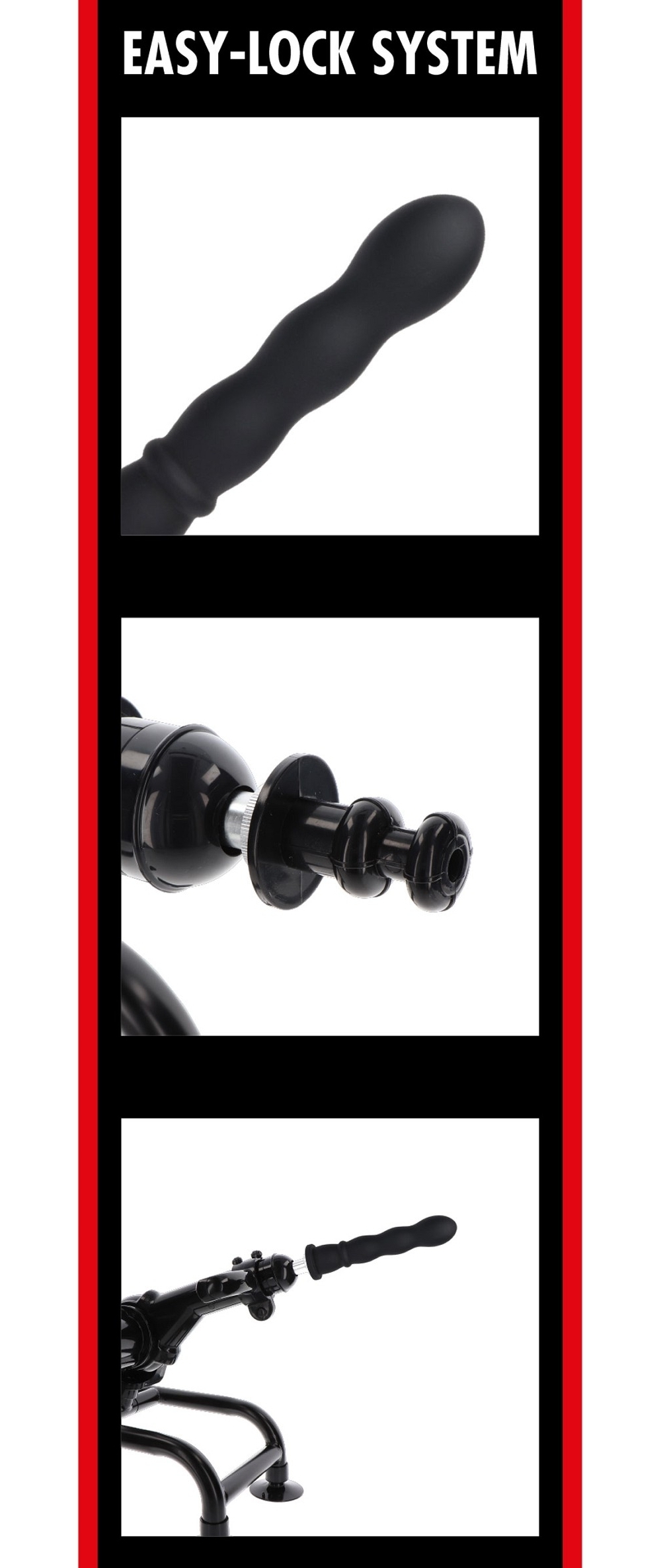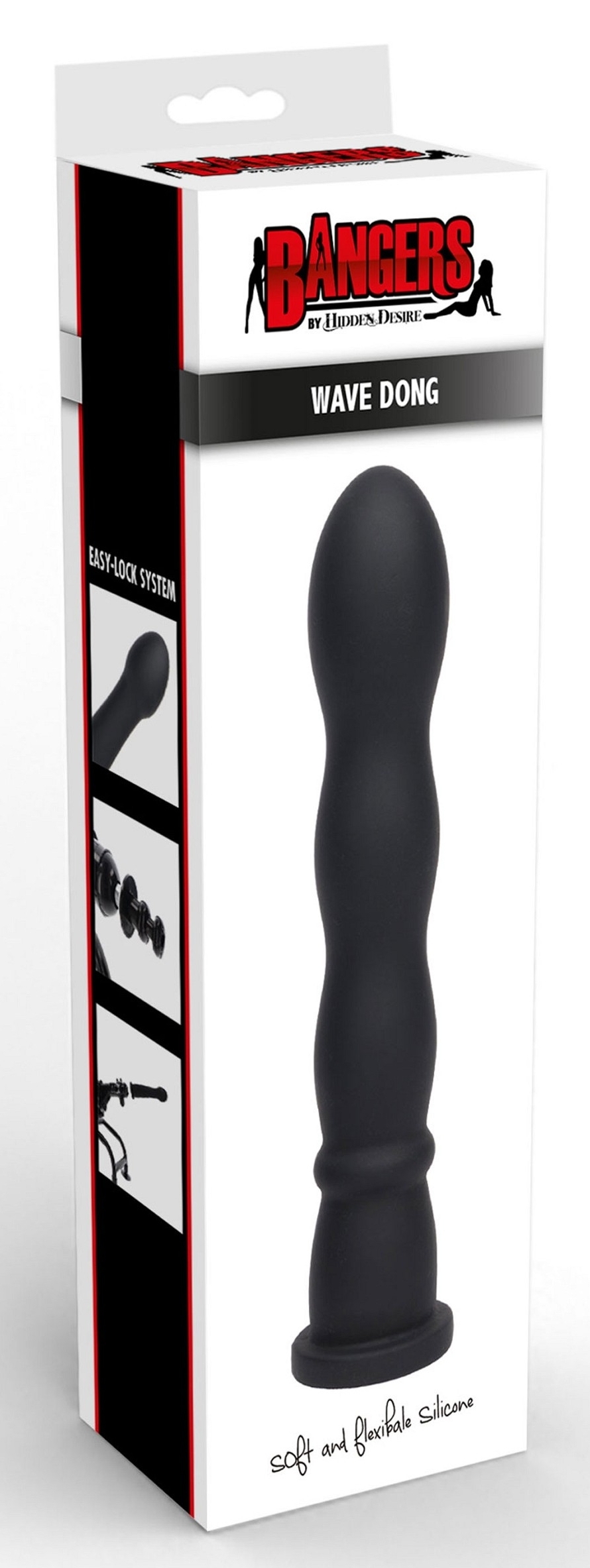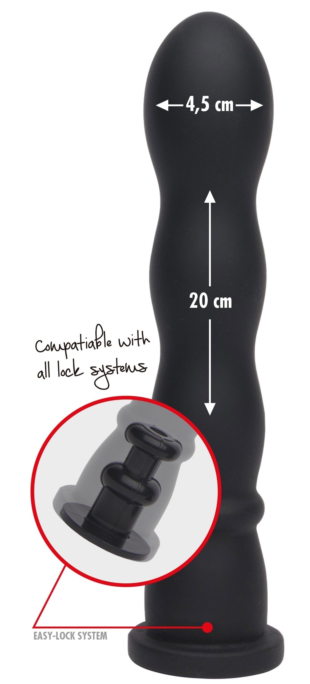 Gode noir Extrémité en forme d’oeuf Corps avec une forme de vagues Compatible avec les systèmes Easy-Lock Longueur insérable de 19 cm. Largeur de 4 cm. En silicone