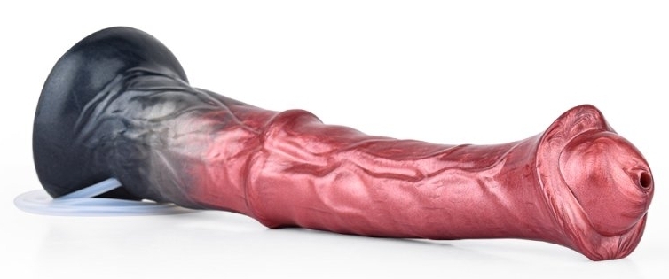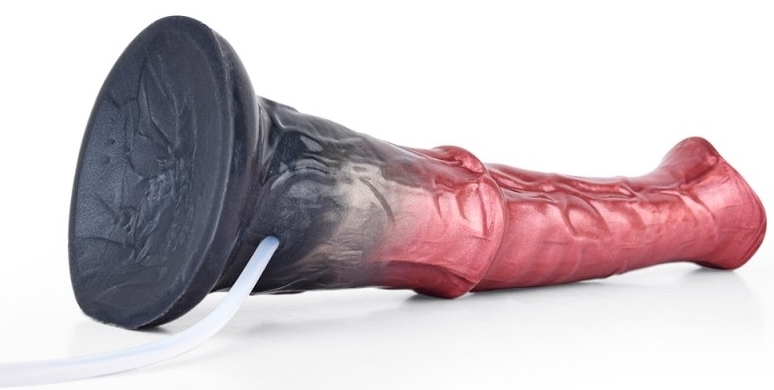 Gode rose et noir avec une forme de sexe de cheval. Longueur insérable de 25 cm et largeur de 3.5 à 6 cm. Seringue de 100 ml et poire de 30 ml. En silicone