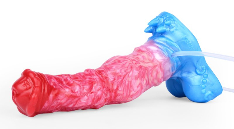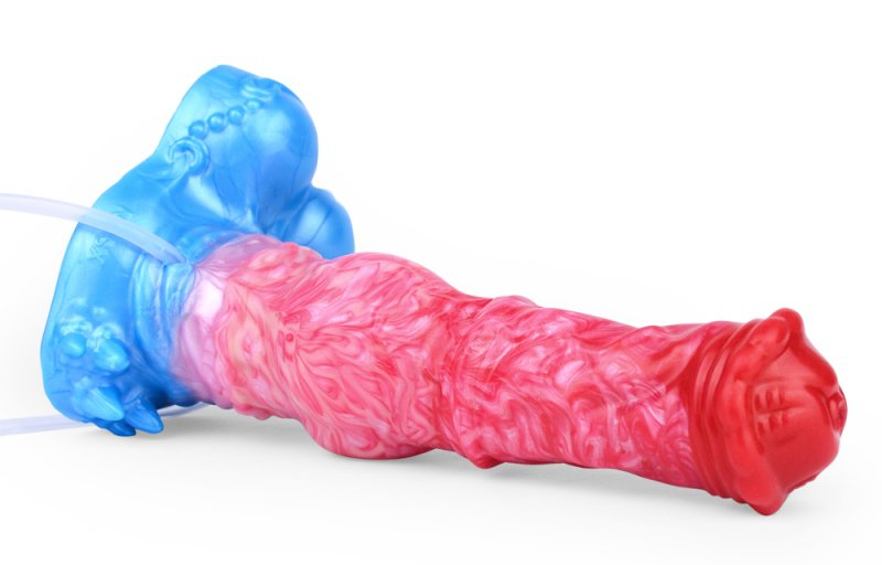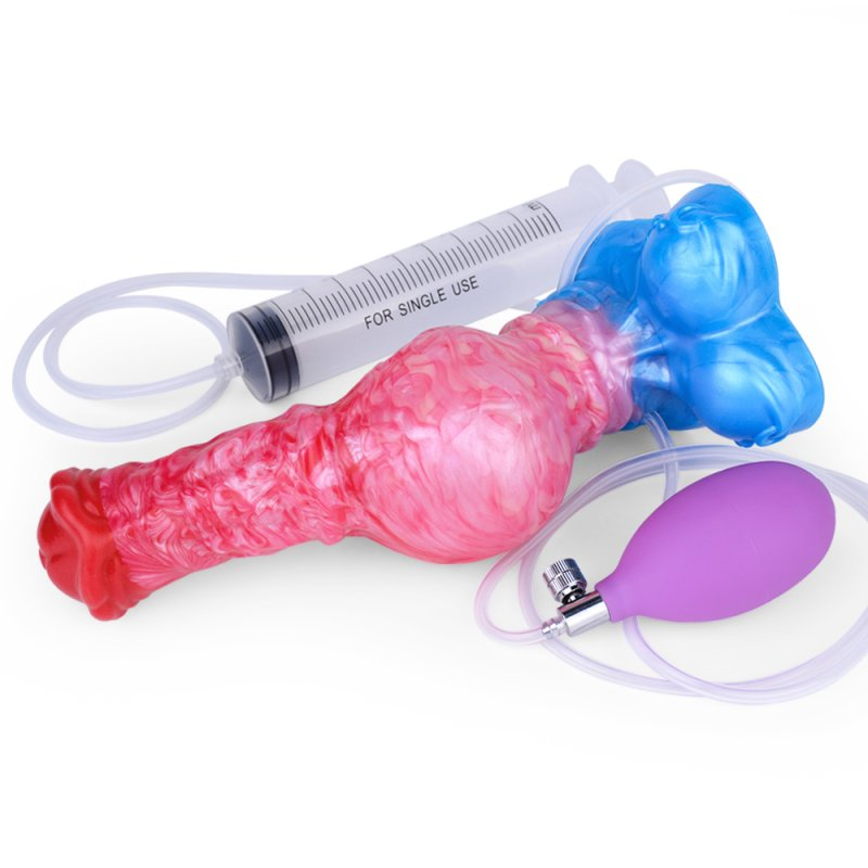 Gode avec les couleurs Rose et bleue et une forme de sexe de cheval.Longueur insérable de 18 cm. Largeur de 4.5 cm au niveau du gland.Largeur maximale de 8.5 cm une fois gonflé.En silicone.