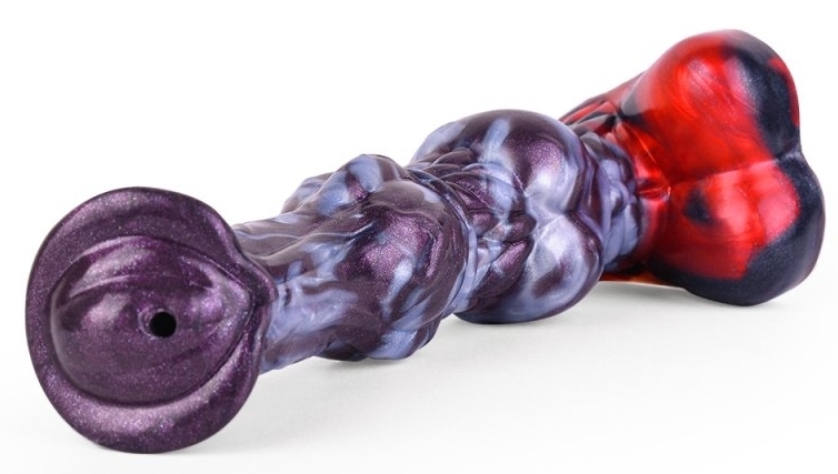 Gode à la forme originale avec base ventouse et bourses. Longueur insérable de 22 cm et largeur de 5 à 6 cm Fourni avec une pompe de 100 ml et une poire. En silicone