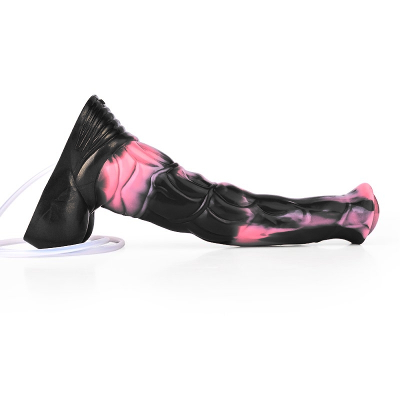 Gode éjaculateur rose et noir conçu avec une forme de sexe de cheval.Base avec les bourses et une ventouse. Longueur insérable de 22 cm, largeur maximale de 6 cm. En silicone