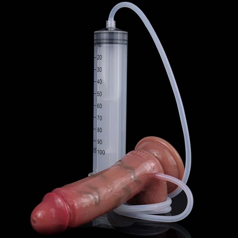 Gode éjaculateur, typé méditerranéen. Veines bleues en relief. Gland décalotté et bourses fines et rondes. Seringue de 100 ml et poire. Dimensions : Longueur insérable de 11.5 cm. Largeur maximale de 3.7 cm. En silicone.