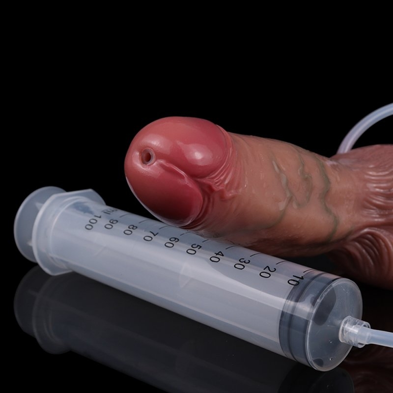 Gode éjaculateur. Seringue de 100 ml et poire. Gland décalotté et rosé. Surface veinée et bourses rondes. Dimensions : Longueur insérable de 14 cm. Largeur de 4 à 4.6 cm. En silicone.