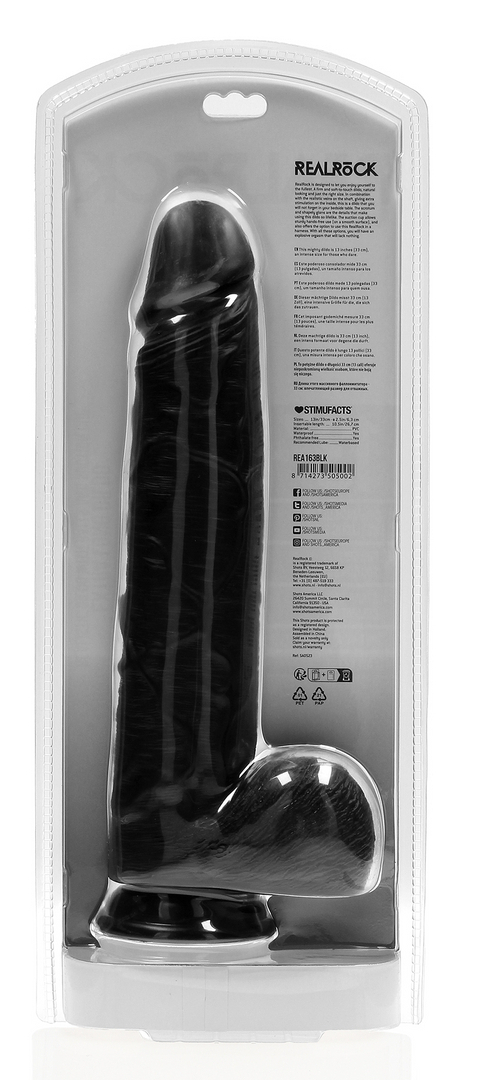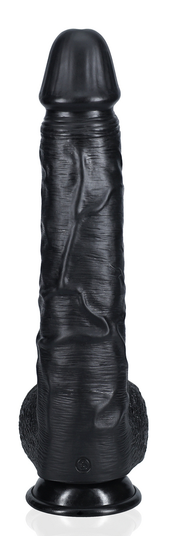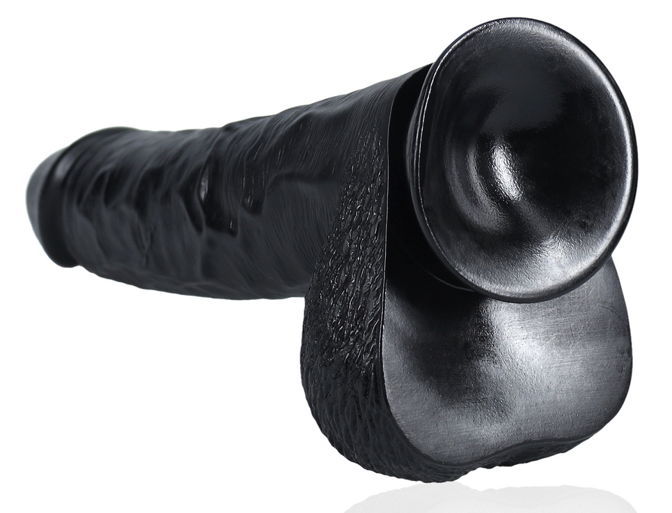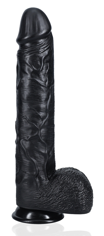 Gode noir avec gland décalotté et surface veinée Base ventouse Longueur insérable de 26.5 cm et largeur maximale de 6.5 cm. Poids de 1.550 kg En PVC