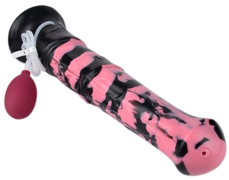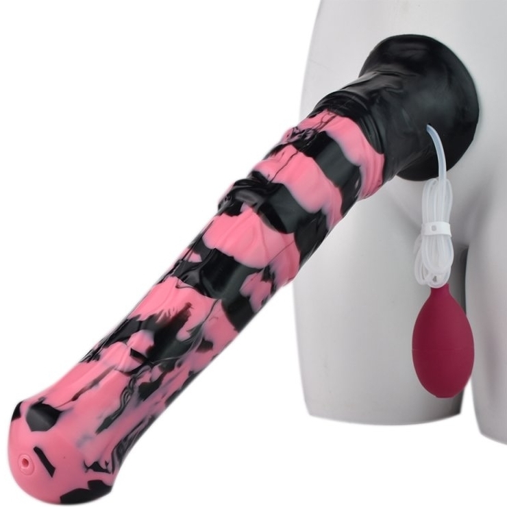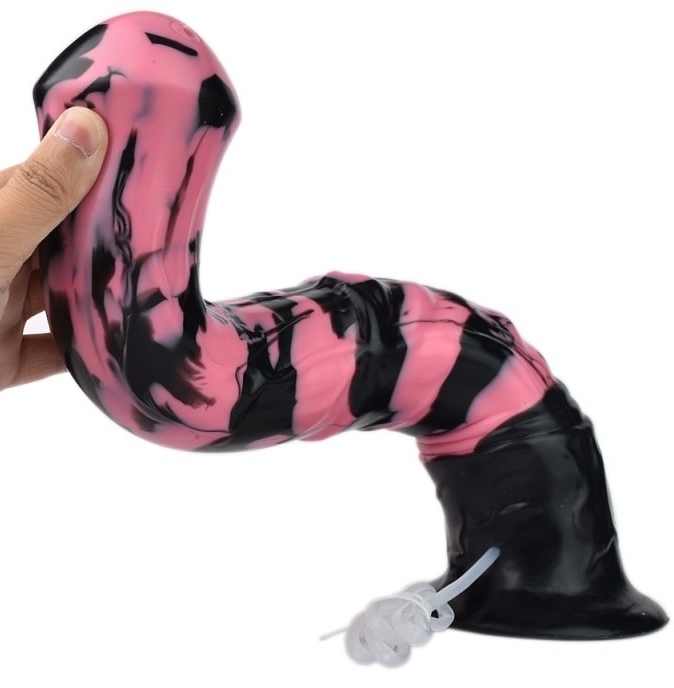 Gode éjaculateur en forme de sexe de cheval, bicolore rose et noir. Gland arrondi. Seringue de 100 ml et poire. Base ventouse. Dimensions : Longueur insérable de 32 cm. Largeur de 6.4 cm. En silicone.