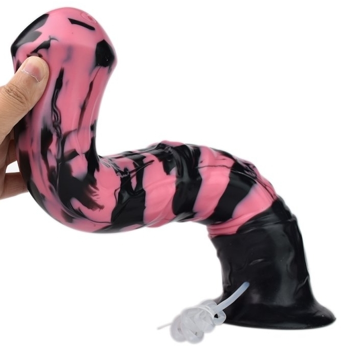 Gode éjaculateur en forme de sexe de cheval, bicolore rose et noir. Gland arrondi. Seringue de 100 ml et poire. Base ventouse. Dimensions : Longueur de 26 cm. Largeur maximale de 4.5 cm. En silicone.