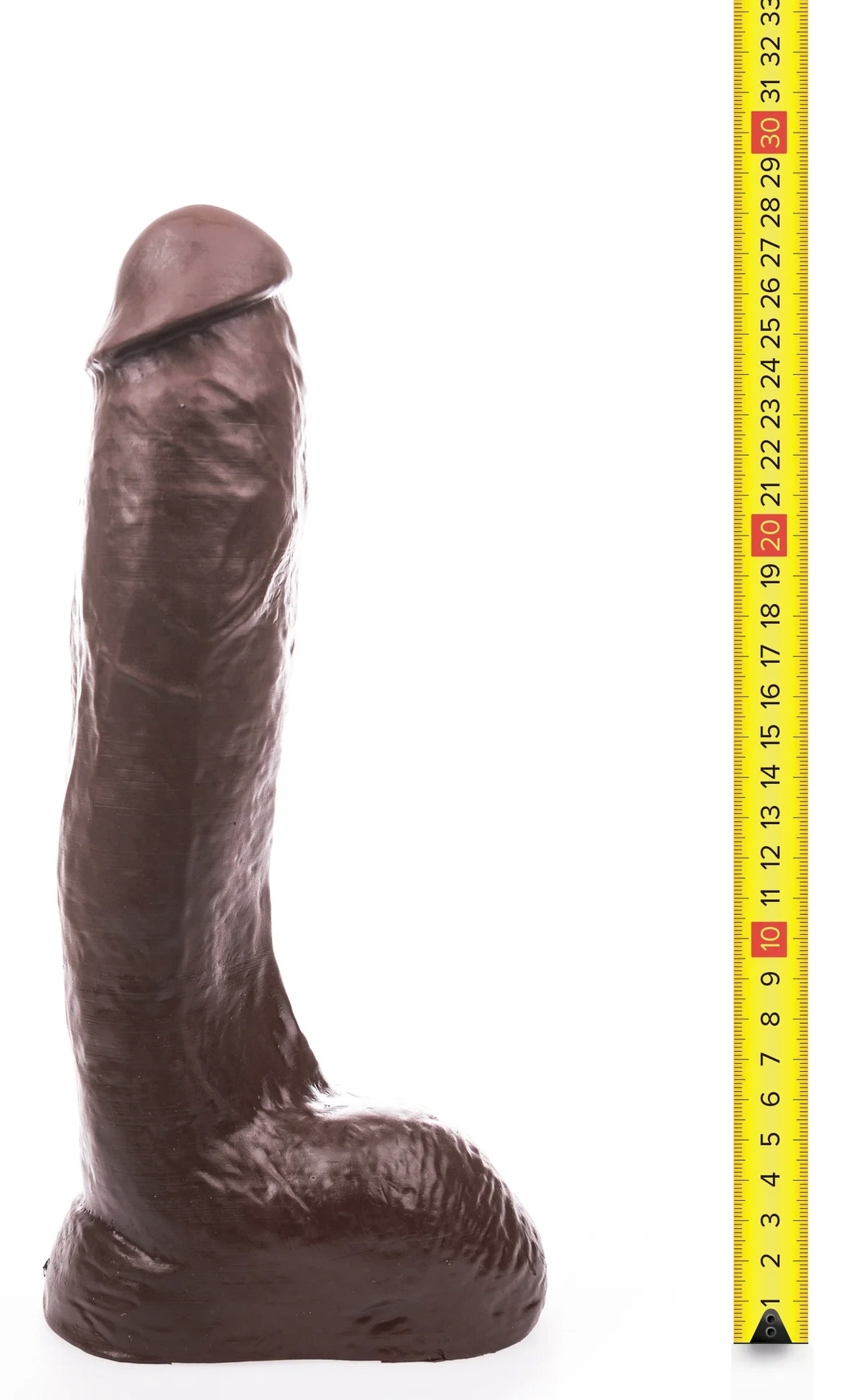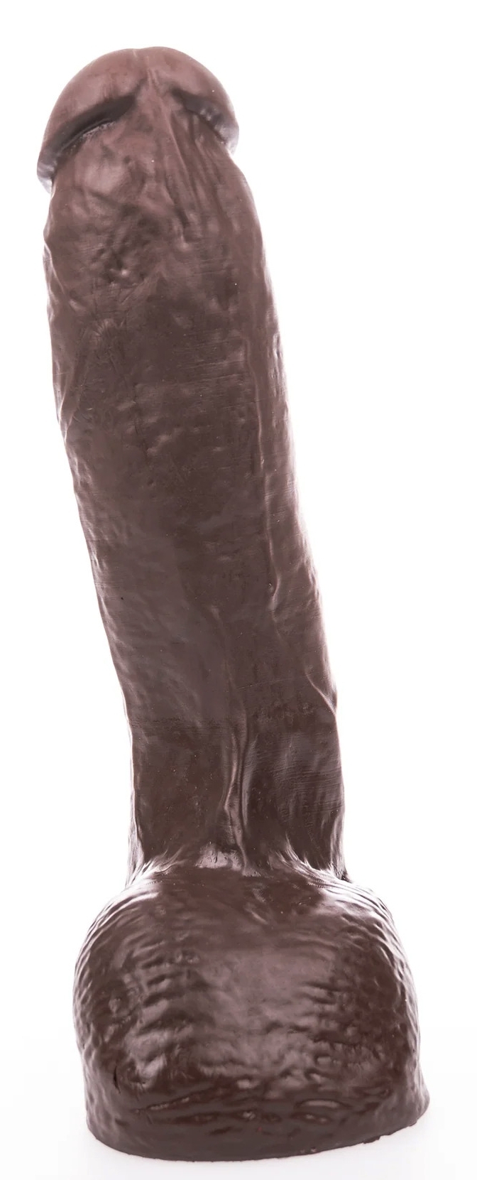 Gode marron avec une longueur insérable de 22 cm et une largeur maximale de 6.5 cm.La forme est réaliste, le gland est sans prépuce et la surface est veinée. La base comporte une ventouse amovible. En PVC sans phtalates.