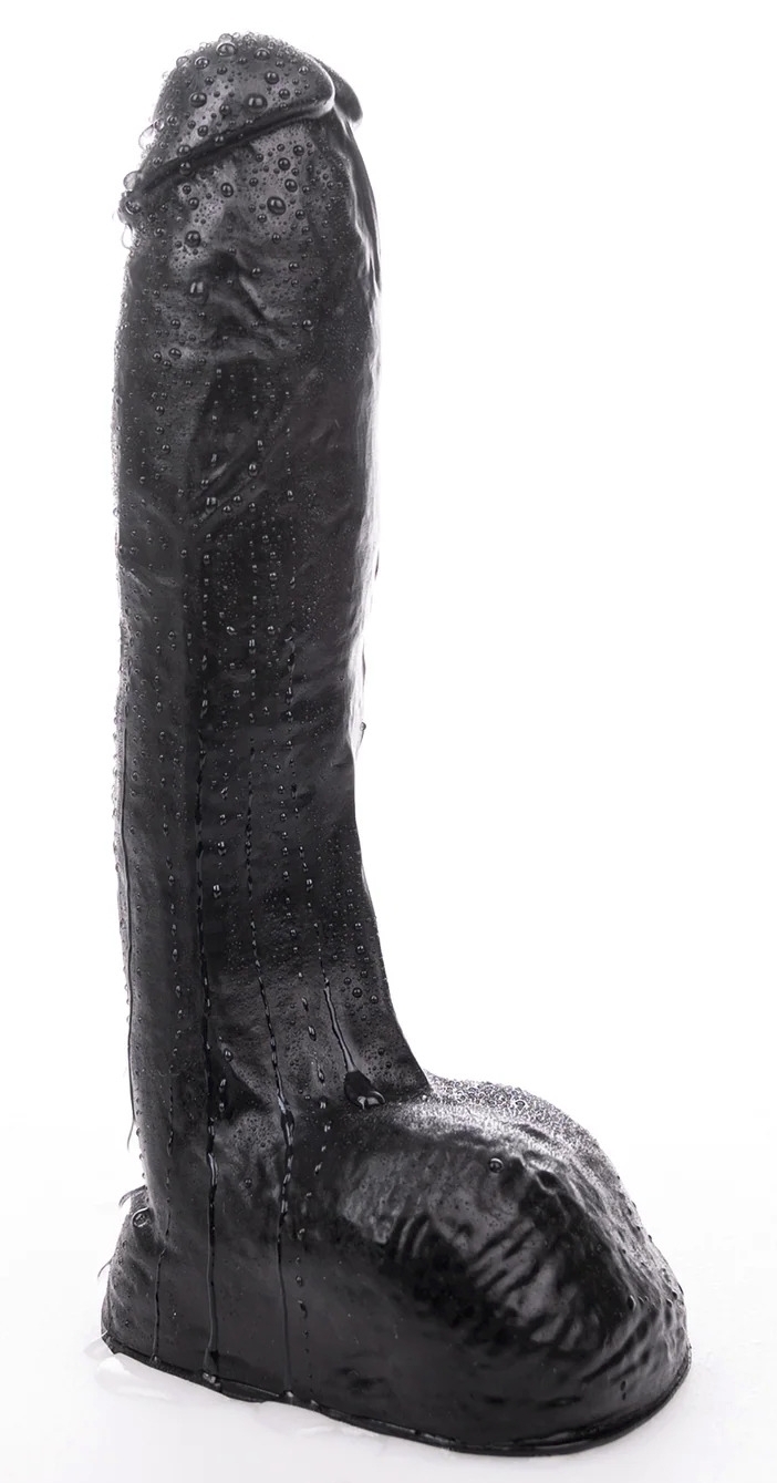 Gode noir avec une forme réaliste et une longueur insérable de 17 cm.Largeur maximale de 5 cm.Le gland est sans prépuce et la surface est veinée.La base comporte les bourses et une base ventouse amovible. Fabriqué en PVC sans phtalates.