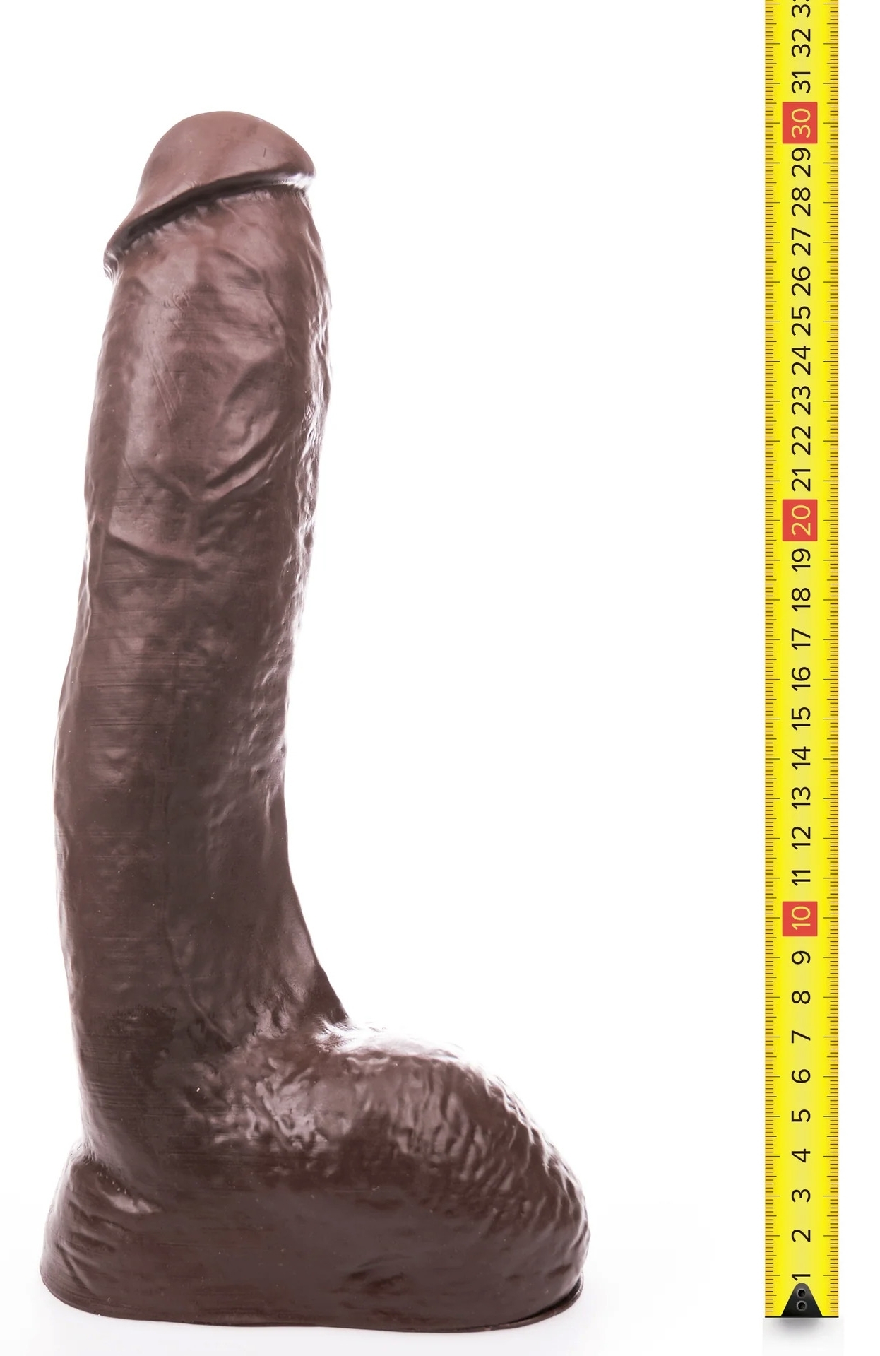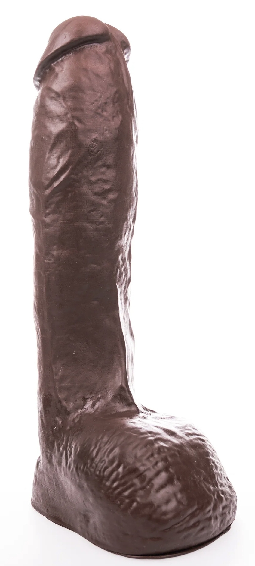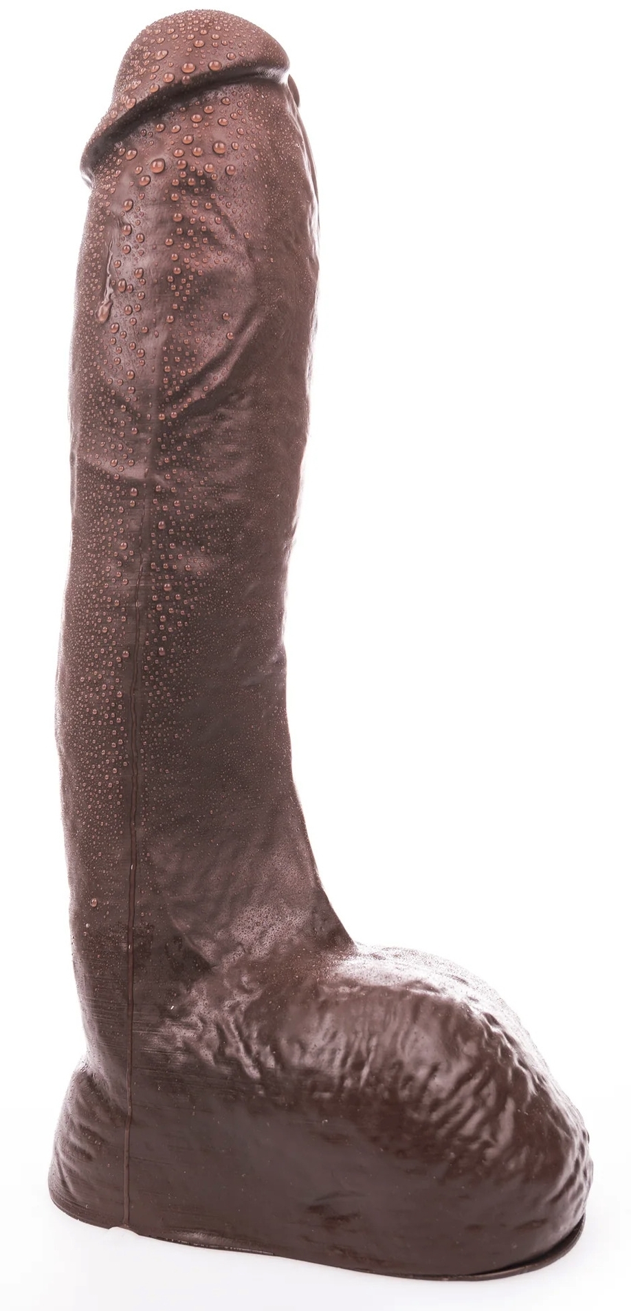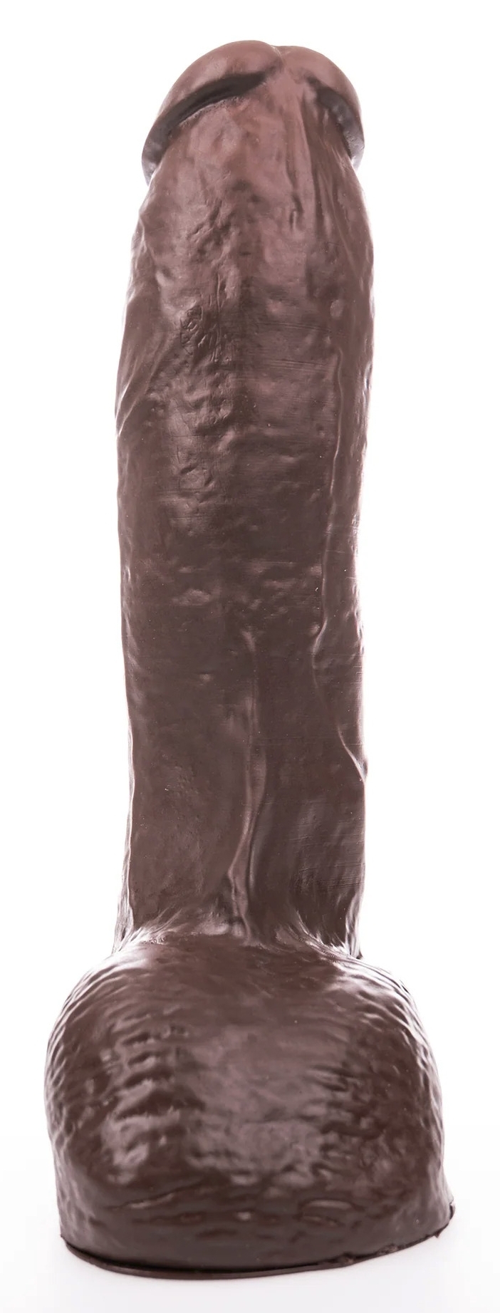 Gode marron avec des volumes conséquents : 26 cm de longueur insérable et 7.5 cm de largeur maximale.Le gland est sans prépuce et la surface est veinée. Base ventouse amovible.En PVC sans phtalates.
