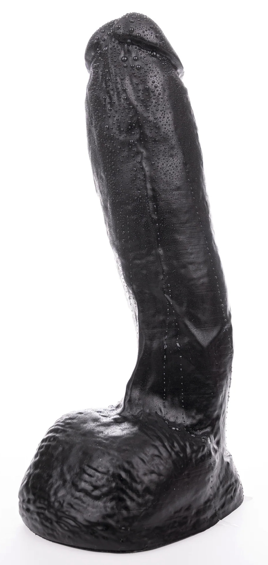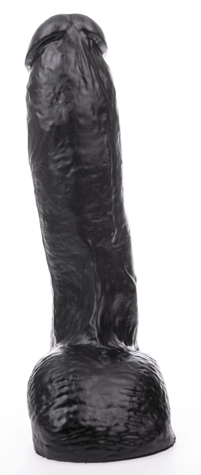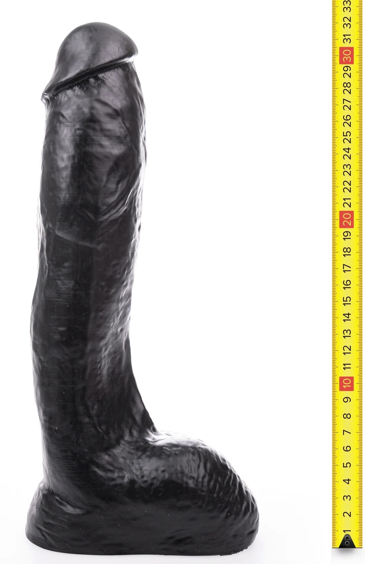 Gode noir avec une forme réaliste et des dimensions importantes.Le gland est sans prépuce et la surface est veinée. La longueur insérable est de 26 cm. La largeur maximale est de 7.5 cm. Avec la base ventouse amovible.En PVC sans phtalates.