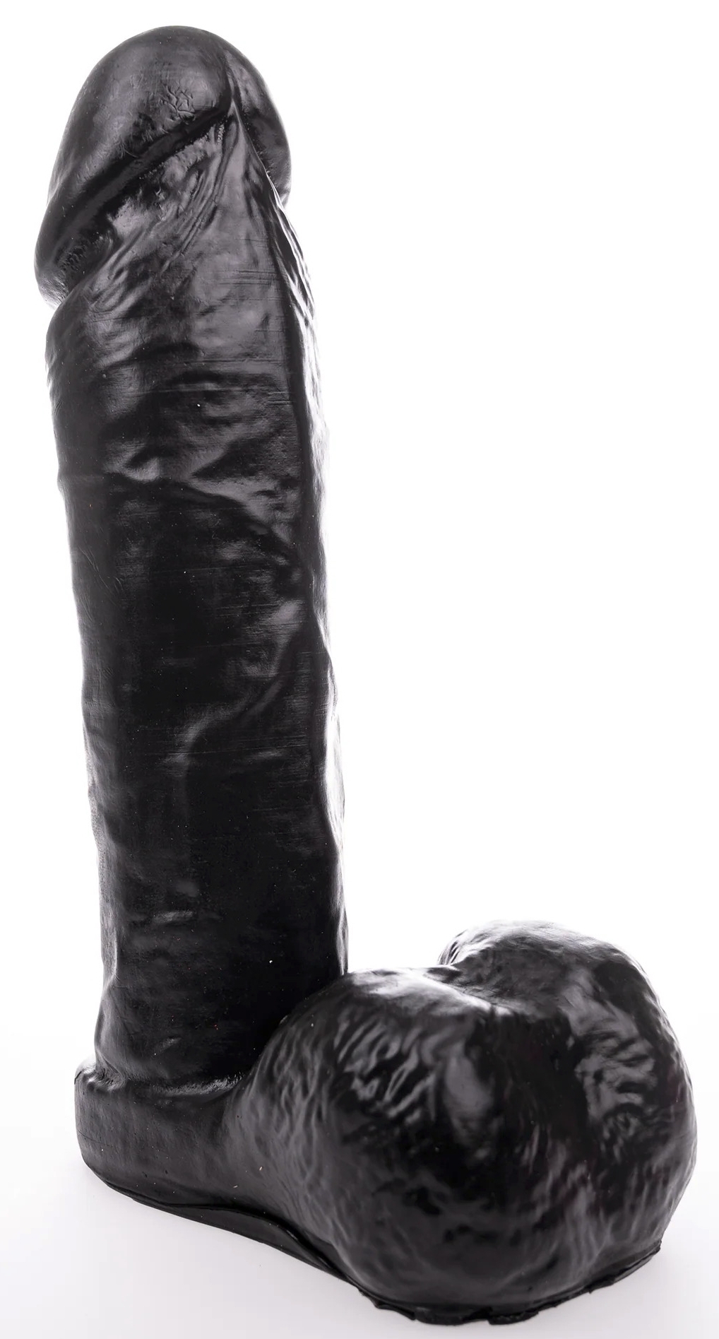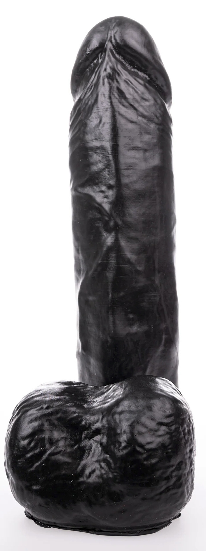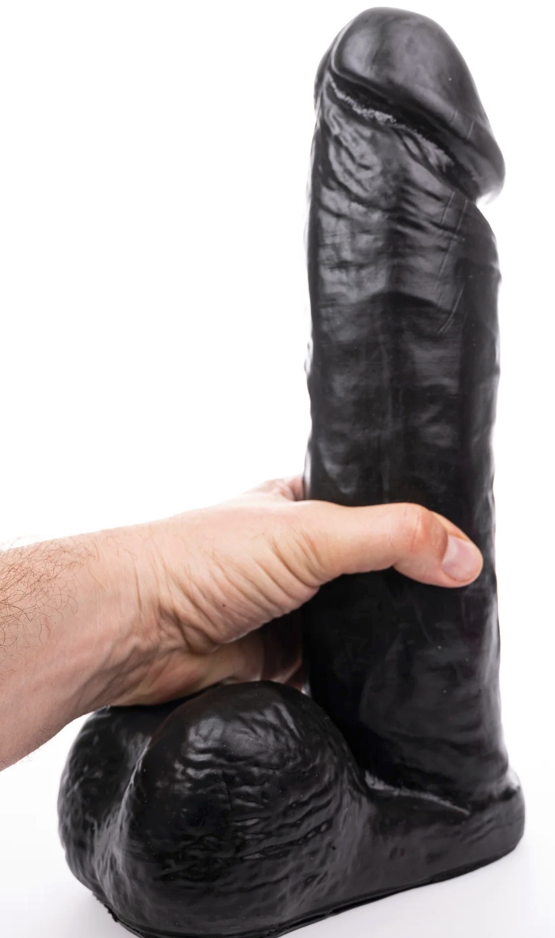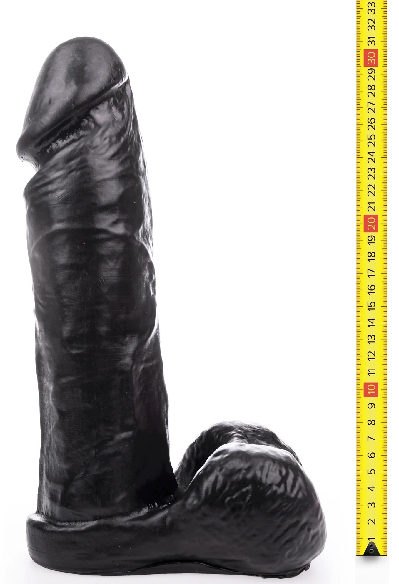 Gode noir avec des dimensions importantes et une forme réaliste.Le gland est décalotté et la surface est veinée.La longueur insérable est de 28 cm. Largeur maximale de 8 cm. Base ventouse amovible. En PVC sans phtalates.