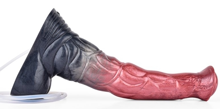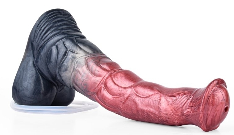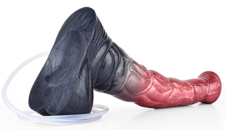Gode avec une forme de sexe de cheval, avec une base ventouse. Longueur insérable de 22 cm et largeur de 3.5 à 5 cm. Poire de 30 ml et seringue de 100 ml. En silicone