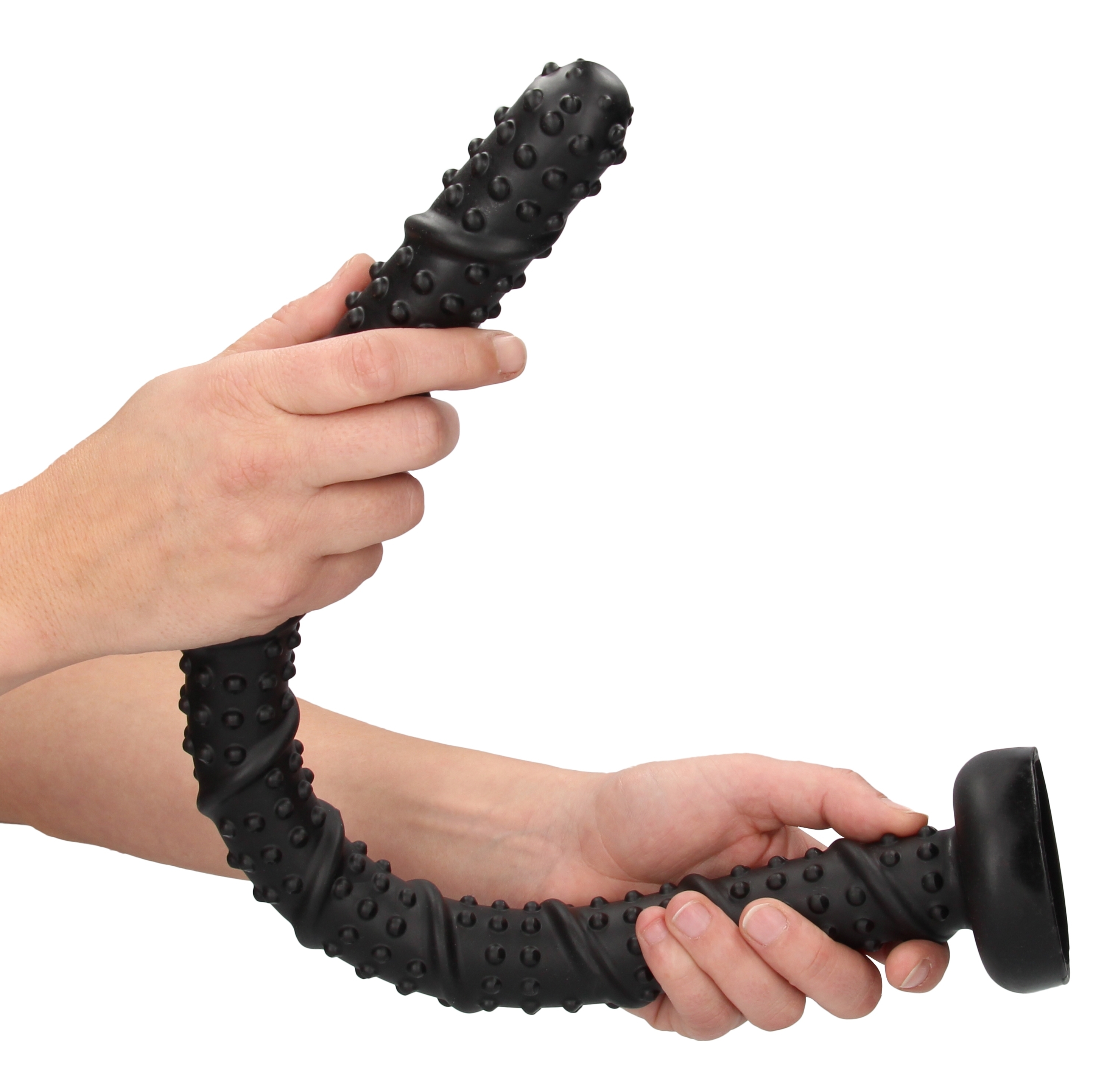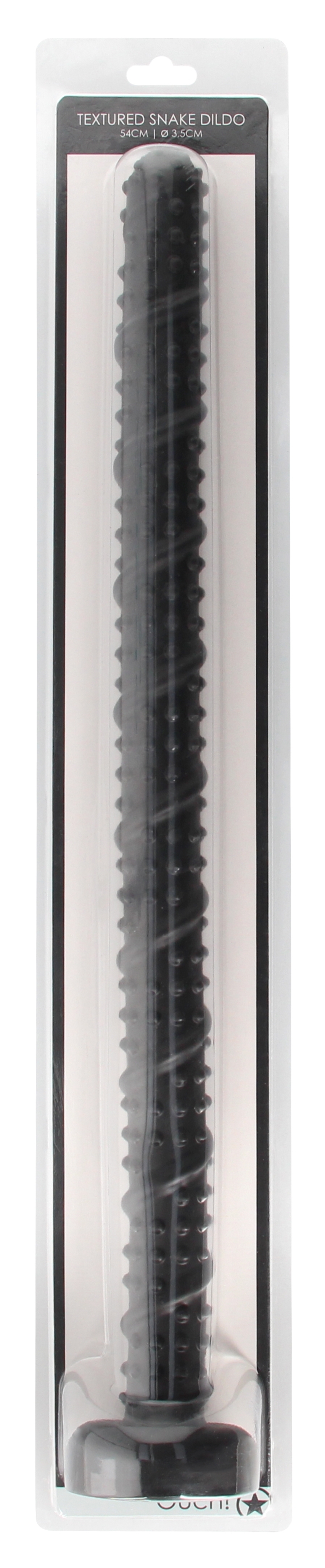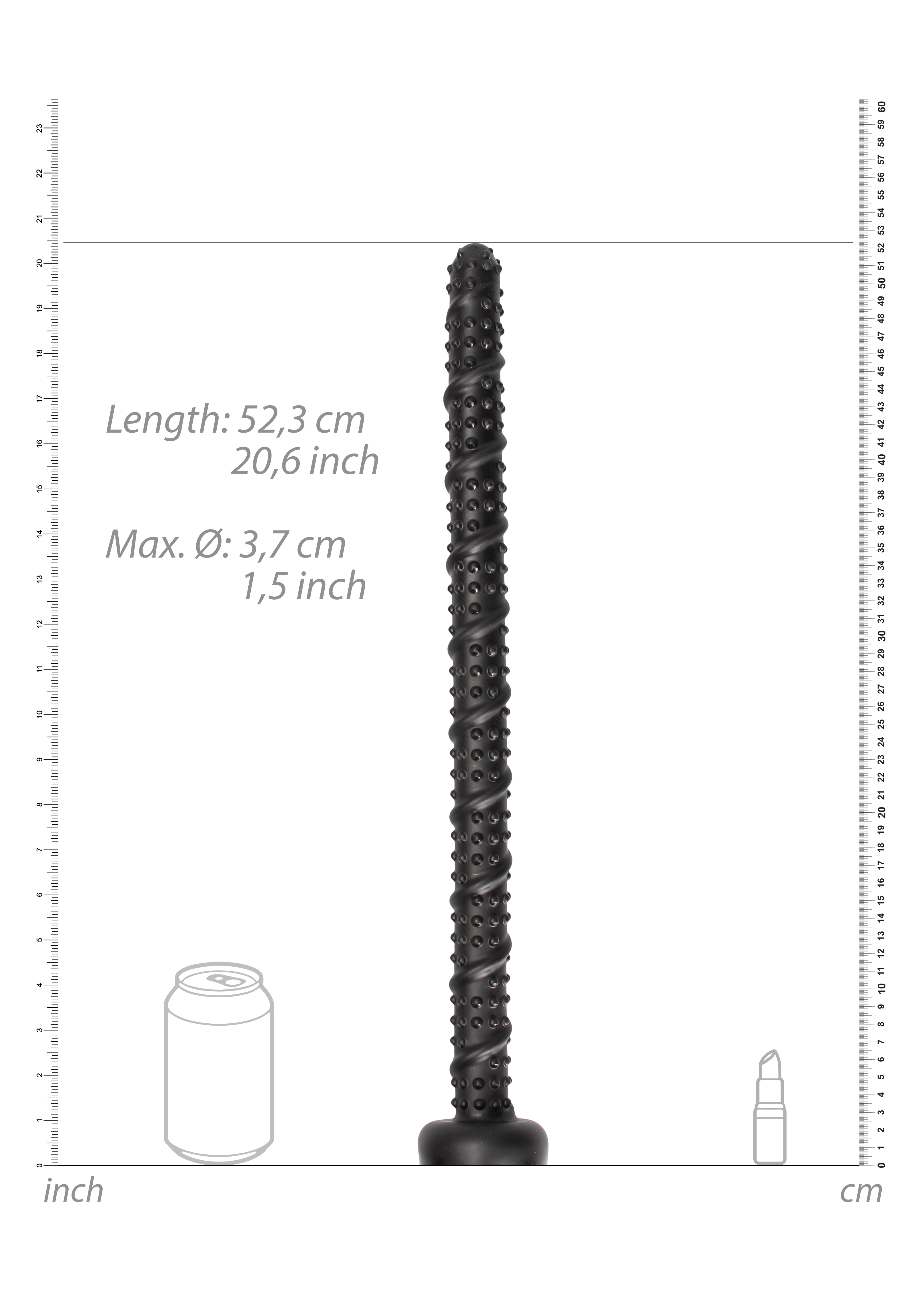 Gode long avec une surface texturée : une ligne torsadée et des bulles.Longueur insérable de 50 cm. Largeur de 4 cm. Structure flexible. Base ventouse. En PVC