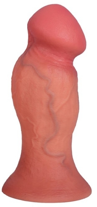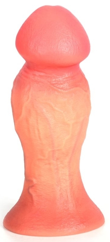 Gode avec gland décalotté et surface texturée. Longueur insérable de 23 cm et largeur de 6.5 à 9.5 cm. En silicone, avec une base ventouse