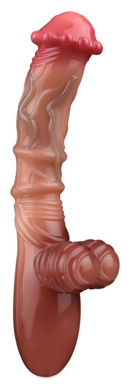 Gode avec une forme réaliste, un gland sans prépuce et épais, et une courbure vers le bas.Surface texturée. La longueur insérable est de 13 cm. La largeur maximale est de 3.7 cm (sur le gland). En PVC dont la structure est ferme.