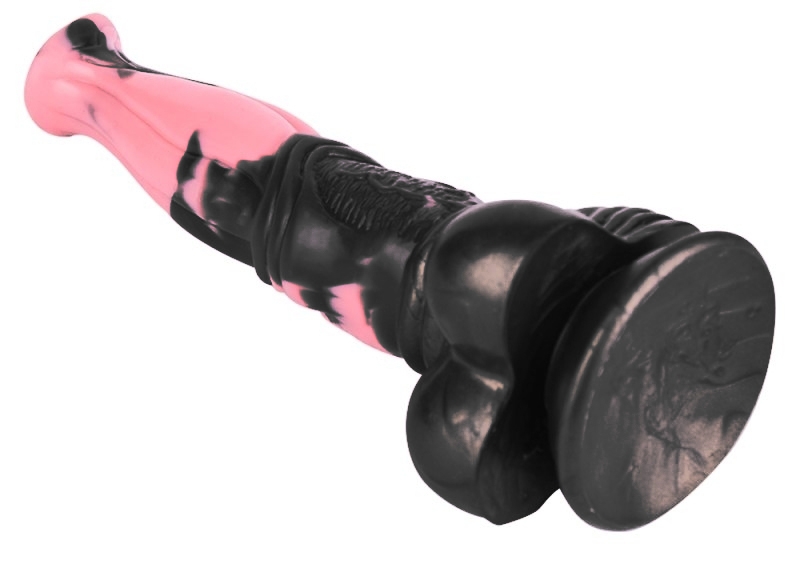 Gode en forme de sexe de cheval avec une couleur noire et rose. Longueur insérable de 19 cm. Largeur de 4 cm au niveau du gland. Largeur maximale de 5 cm.Avec une surface veinée. Base ventouse. En silicone