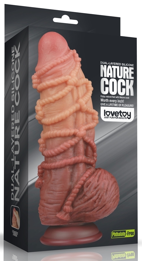 Gode avec une forme à la fois réaliste et bizarre.La surface est comme entourée d’une corde pour lui donner un relief important. Longueur insérable de 17 cm. Largeur de 4.5 à 7 cm. Avec les bourses et une base ventouse. En silicone