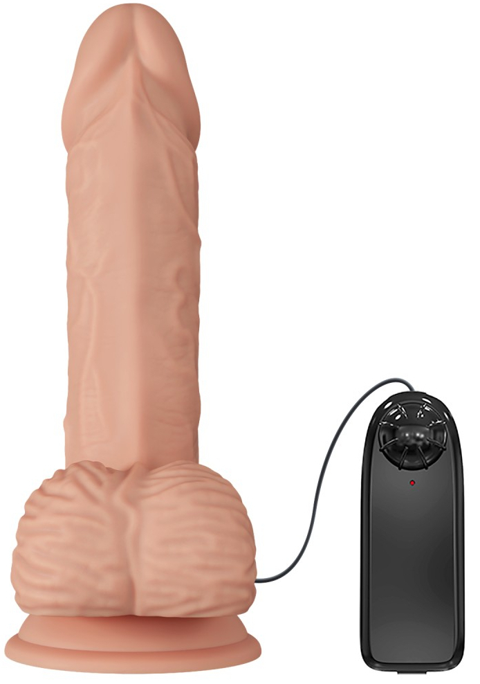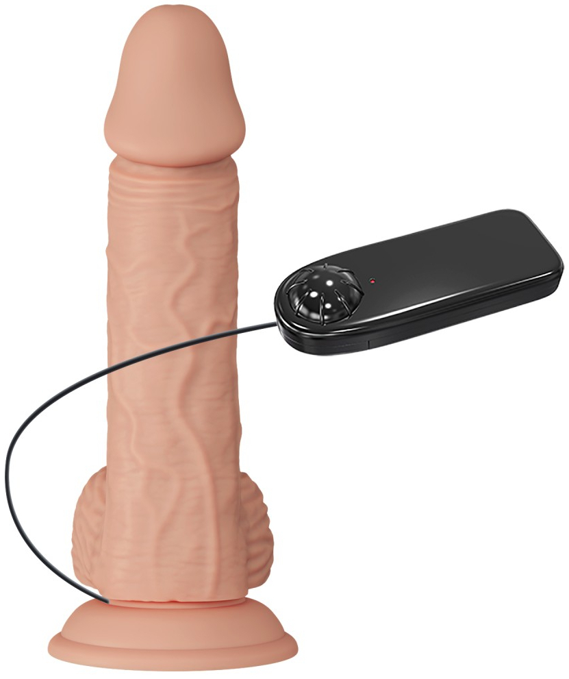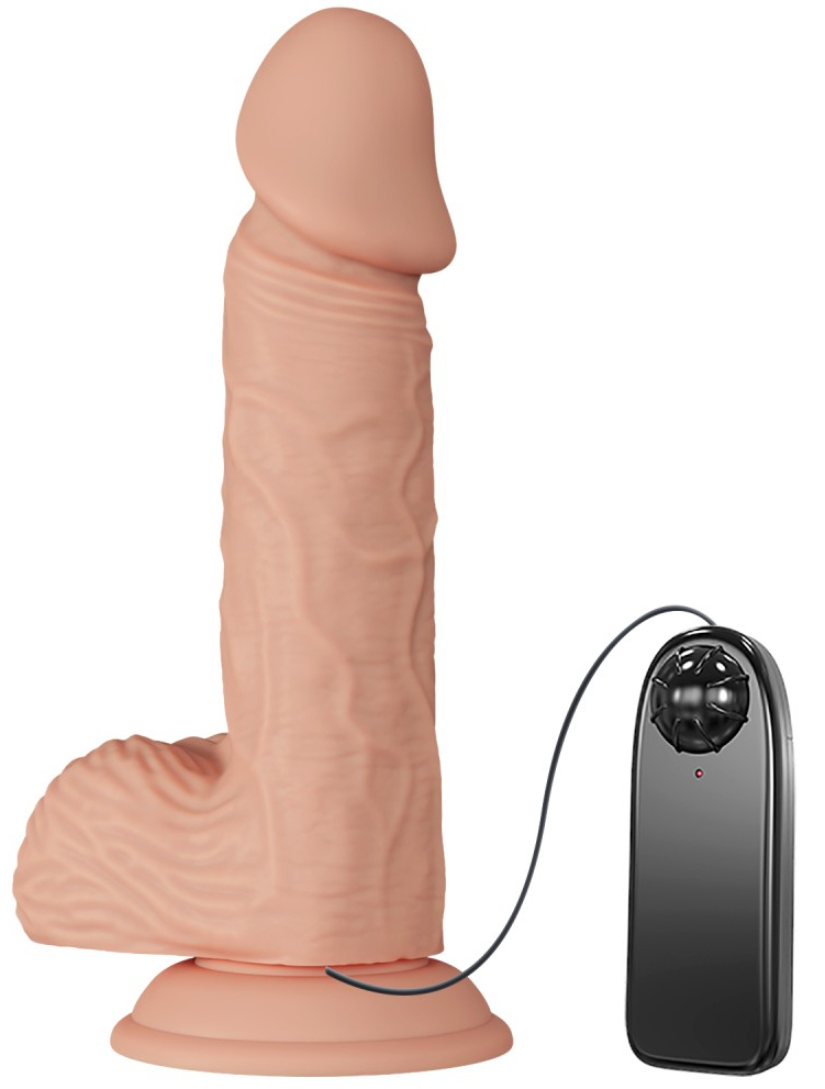 Gode avec bourses, gland décalotté et surface veinée. Base ventouse Télécommande à piles (2AA non fournies) Longueur de 14 cm et largeur de 4 cm. En TPR
