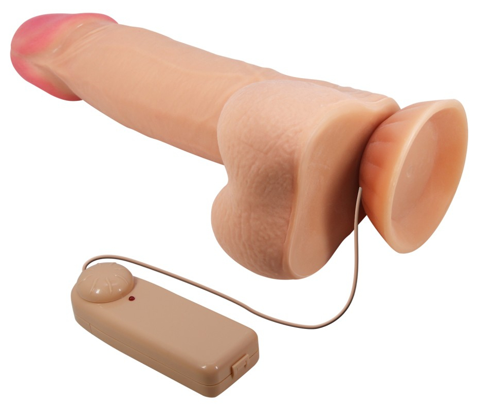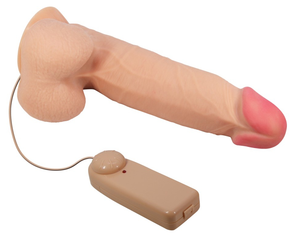 Gode vibrant avec variateur filaire, avec surface texturée. Longueur insérable de 16 cm et largeur de 3.5 à 4.4 cm. En TPR.