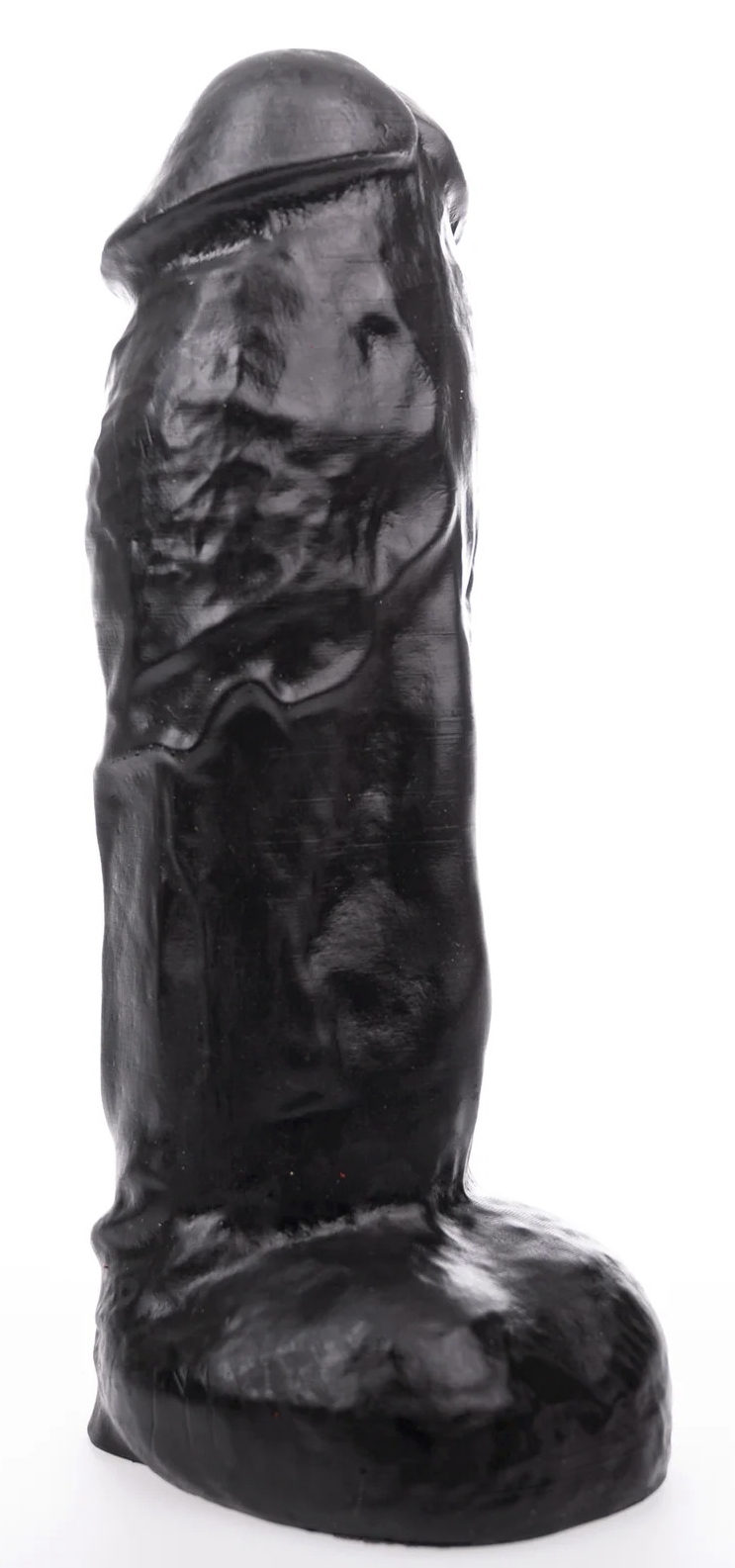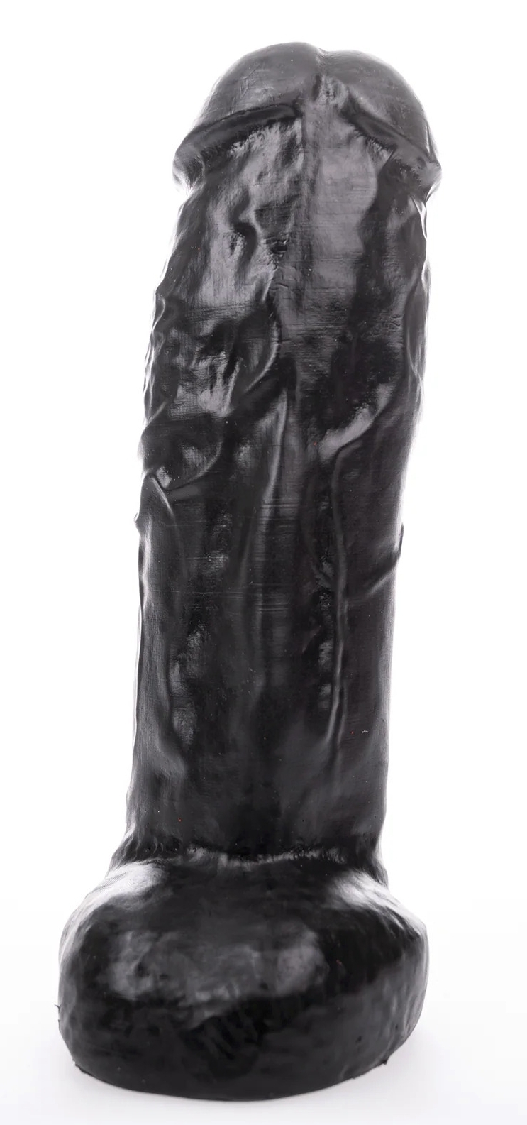 Gode à la surface texturée avec gland décalotté large. Longueur de 21 cm et largeur de 7.5 cm. En PVC noir, avec une base ventouse amovible