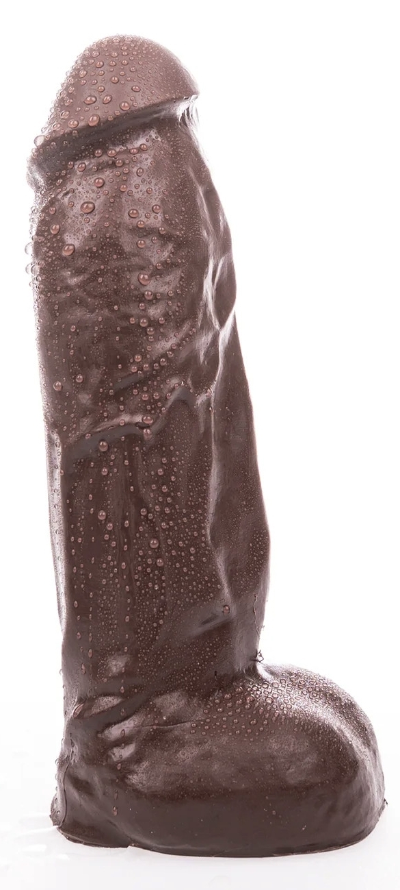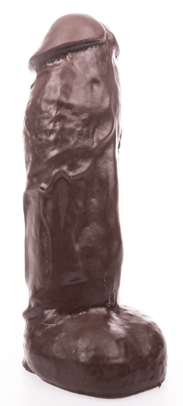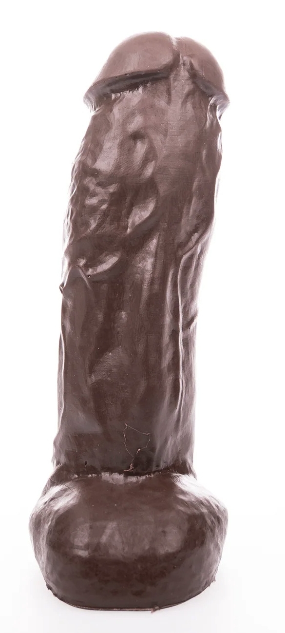 Gode avec un gland décalotté et surface texturée. Longueur insérable de 17 cm. Largeur maximale est de 6 cm Base ventouse amovible En PVC marron