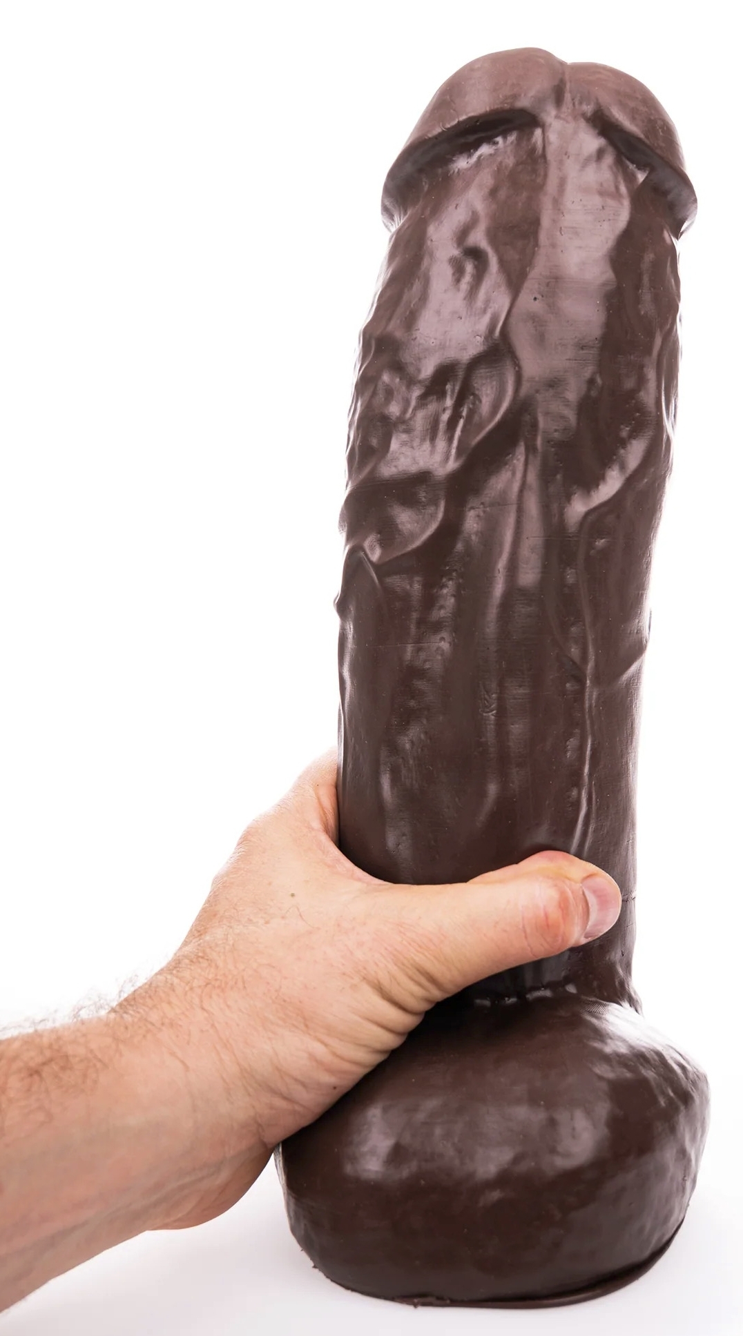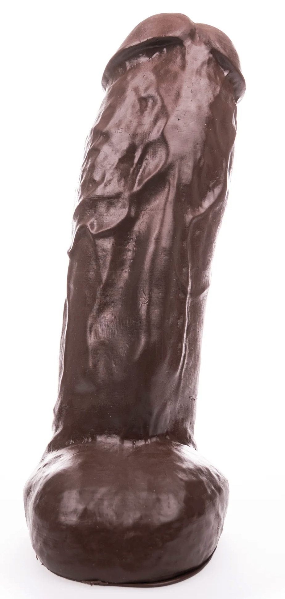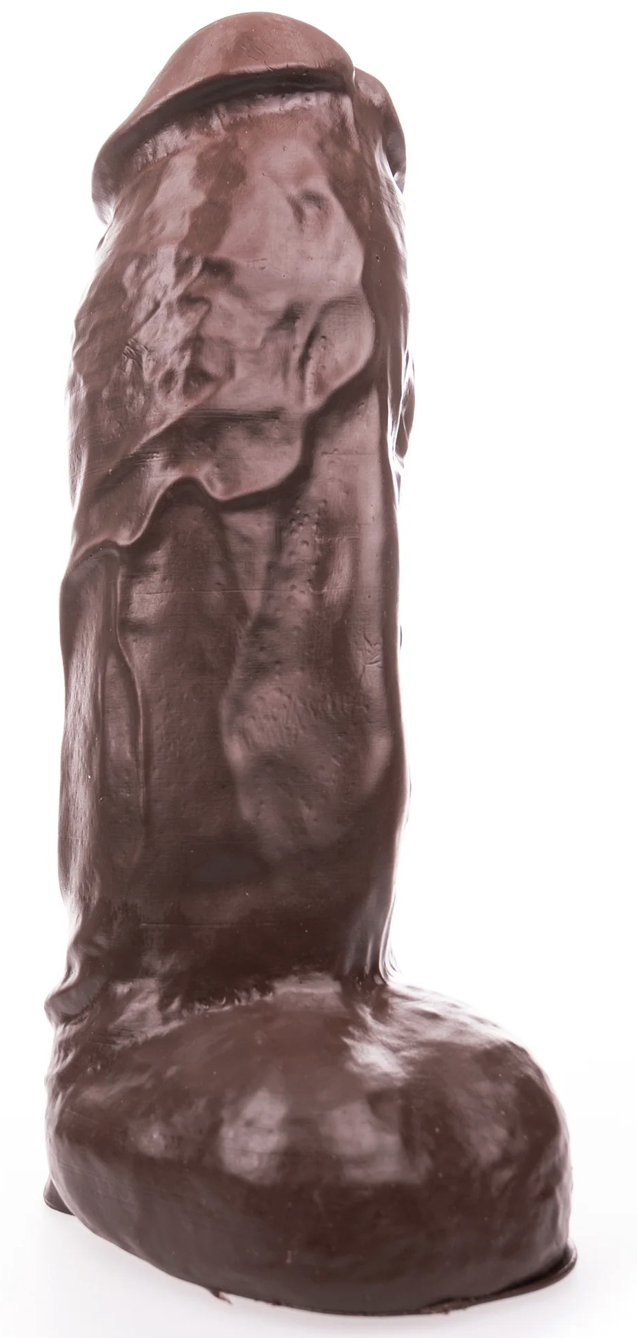 Gode au gland décalotté et large, surface texturée. Bourses rondes et base ventouse amovible. Poids de 2.5 kg En PVC marron