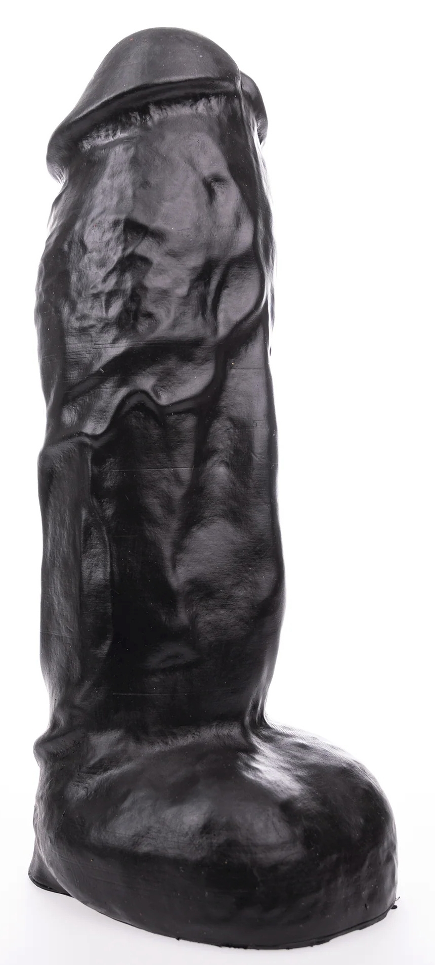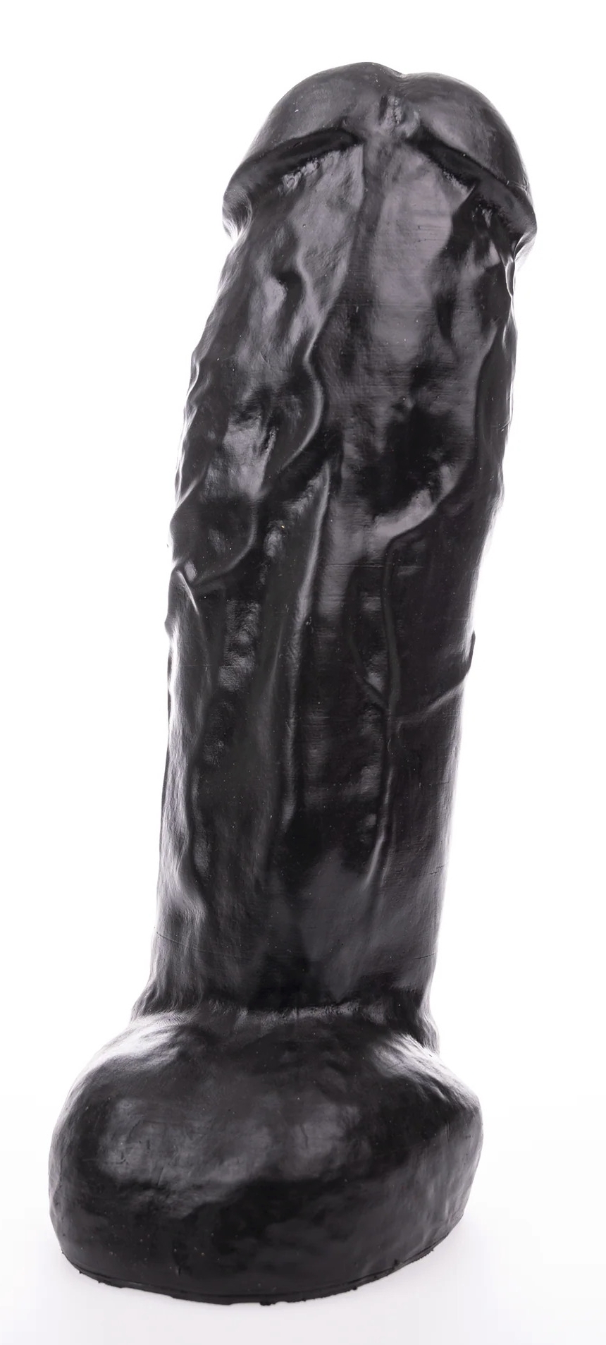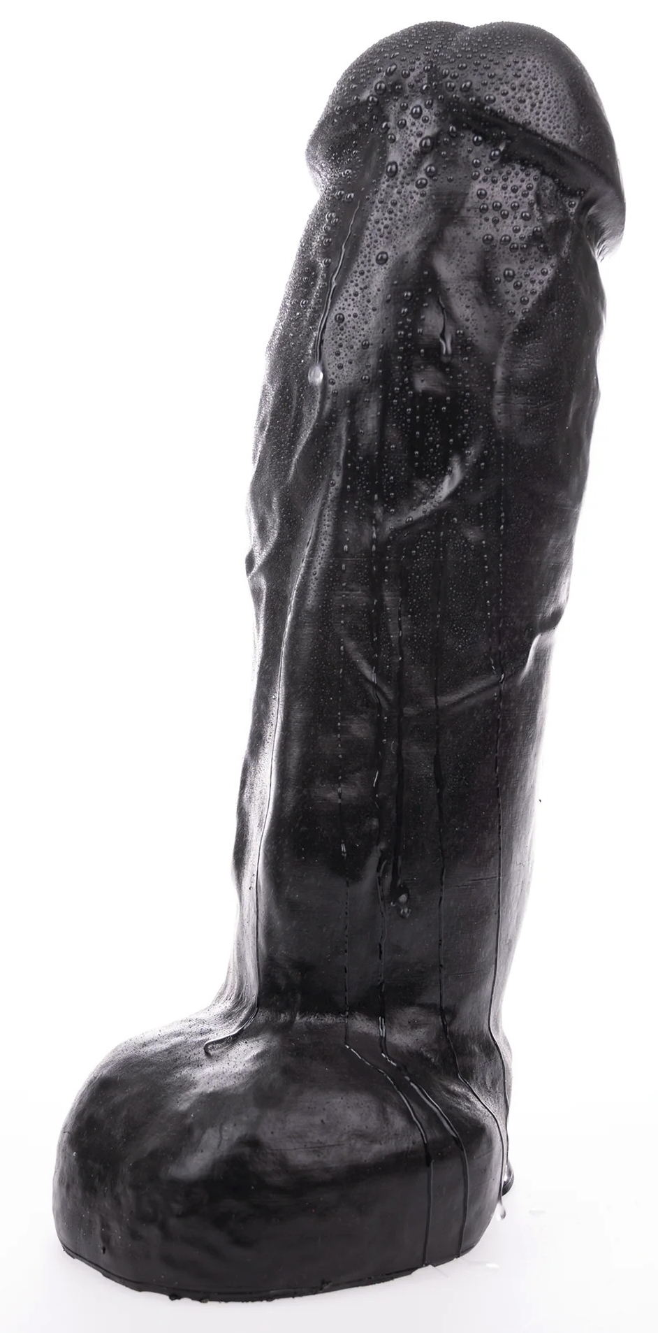 Gode au gland décalotté et large, surface texturée. Bourses rondes et base ventouse amovible. Poids de 2.5 kg. En PVC noir