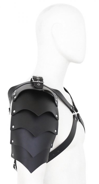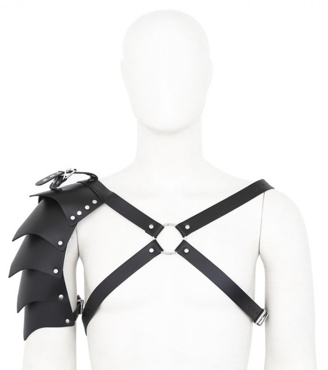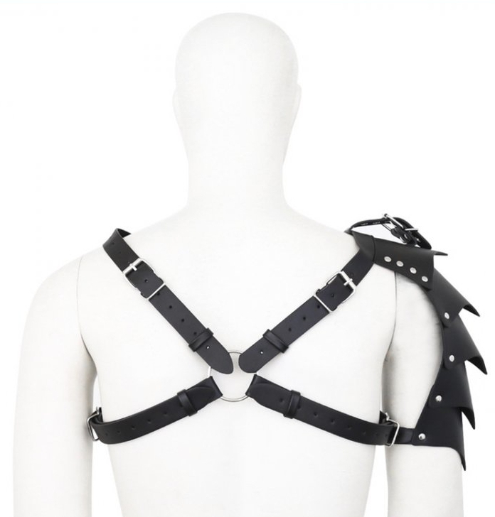 Ce harnais en simili est composé d »une forme en croix sur le devant et d’une épaulette type armure sur le côté.Il donne un style original et puissant pour des moments SM. Fabriqué en polyuréthane