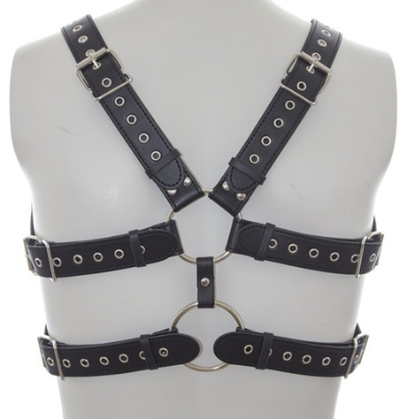 Ce harnais est composé de deux lignes permettant de mettre en valeur le torse et d’obtenir un look sexy et SM.Il est réalisé avec des bande de simili noir de 3cm de largeur avec les rivets en métal. Il s’ajuste parfaitement avec les attaches métalliques. Fabriqué en simili (polyuréthane)