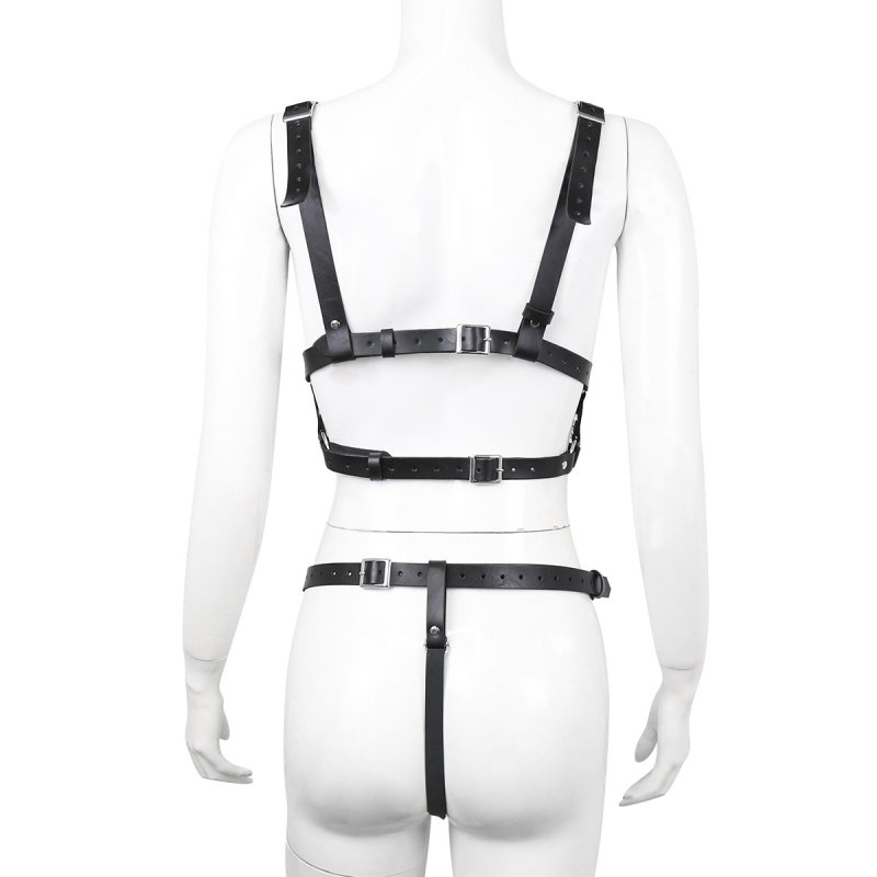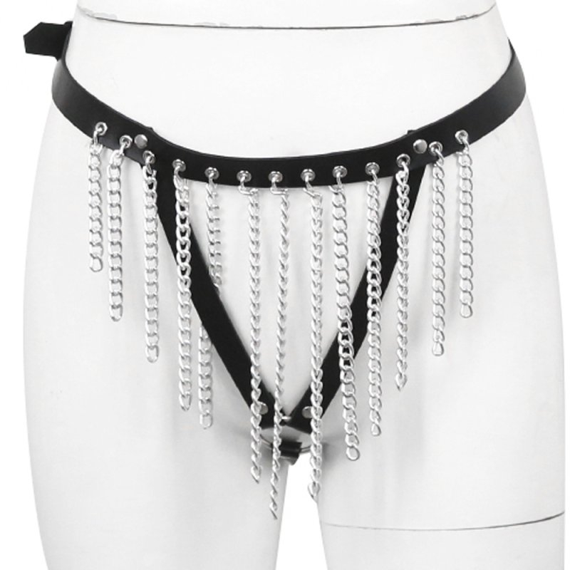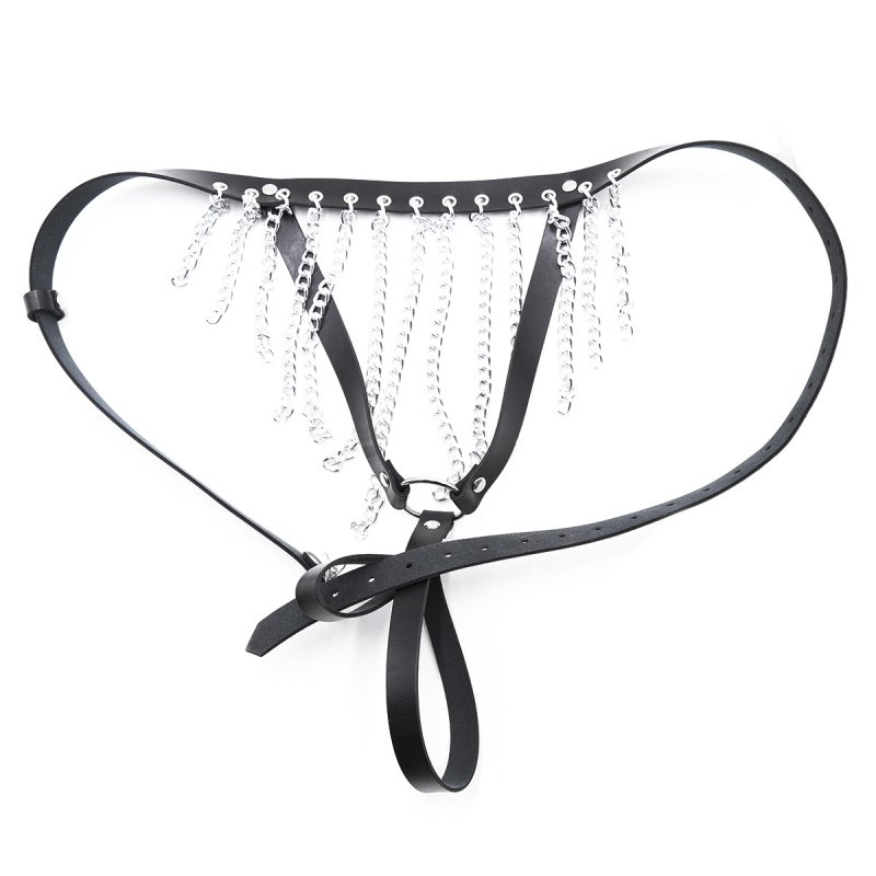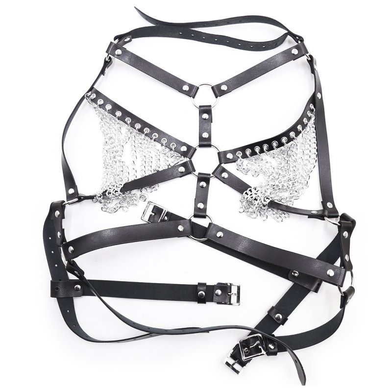 Harnais entier ouvert, avec chaînes métalliques argentées.Longueur ajustable du haut de 67 à 92 cm et longueur ajustable du bas de 67 à 113 cm.En simili noir.