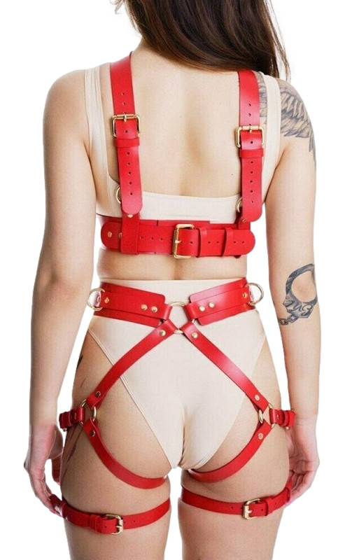 Harnais en 2 parties, une partie pour le buste jusqu’à 95 cm sous la poitrine.Harnais de cuisses ajustable de 75 à 97 cm.En simili rouge.