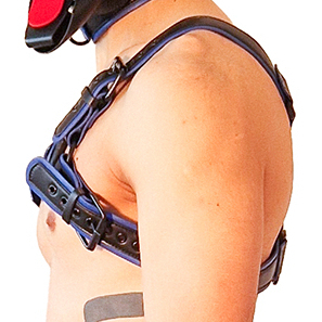 Ce harnais est composé d’anneaux en métal avant et arrière et de sangles ajustables.Il a une patte de chien en relief à l’arrière. Contraste de couleurs noir et bleu. Tour de poitrine : S/M 90 à 105 cm – L/XL 92 à 112 cm. En simili (polyuréthane).