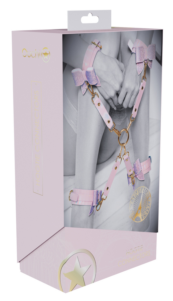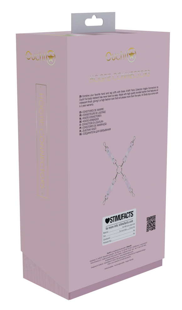 Hogtie avec mousquetons pour y attacher les menottes de chevilles et de poignets. Longueur totale de 37 cm avec branches de 17 cm. En simili rose pâle irisé.