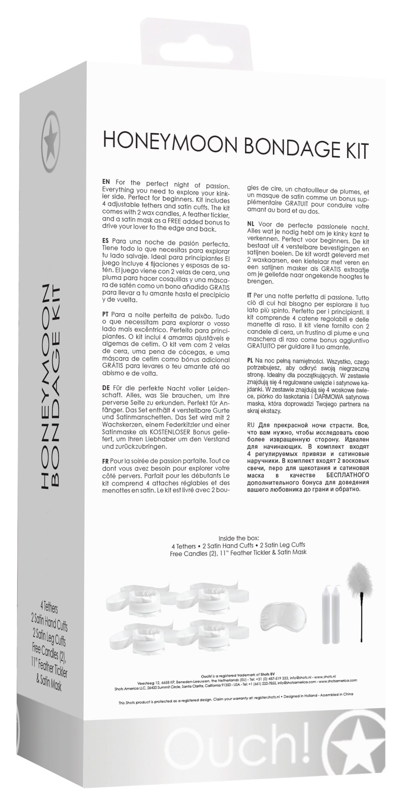Ce kit Bondage HoneyMoon de la marque Ouch! est composé de 4 pièces pour des moments BDSM.Il est créé avec : un masque en satin des menottes de poignets et de chevilles en satin avec les attaches pour le lit un accessoire pour faire des chatouilles 2 bougies