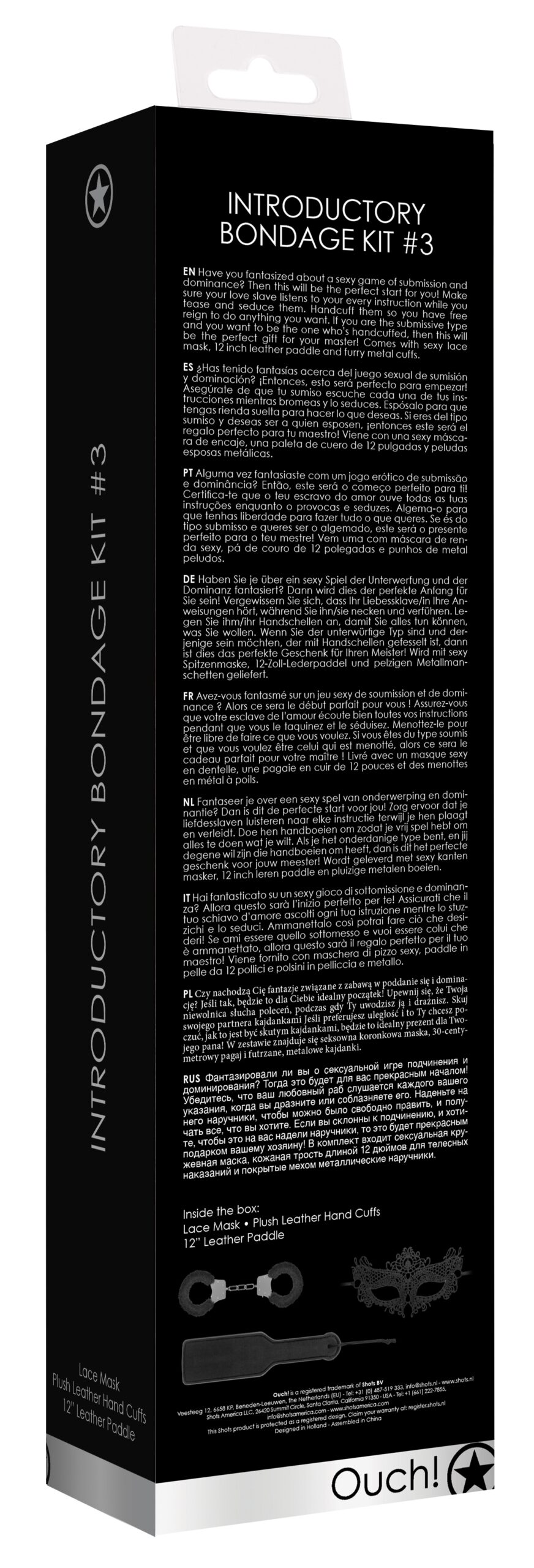 Le kit d’introduction aux pratiques SM est un pack d’accessoires de la marque Ouch!.Il permet de découvrir des plaisirs différents et de s’amuser. Il contient : un masque en dentelle très élégant un paddle de 30cm pour effectuer des fessées excitantes des menottes en métal avec fourrure noire