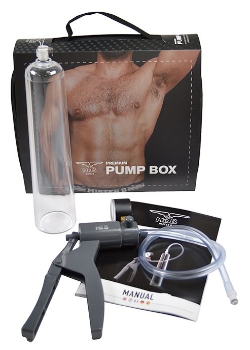 Le kit de pompe à pénis Pump Box S de la marque Mister B est composé de : un cylindre transparent de 23cm un diamètre intérieur à choisir la poignée avec contrôleur de pression. Avec une valve universelle. Diamètres : S = 44mm, M = 51mm, L = 57mm. Cylindre en plastique ABS