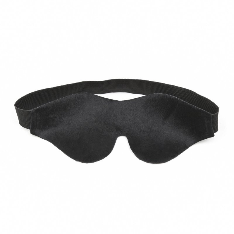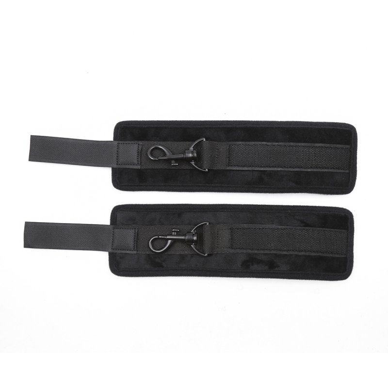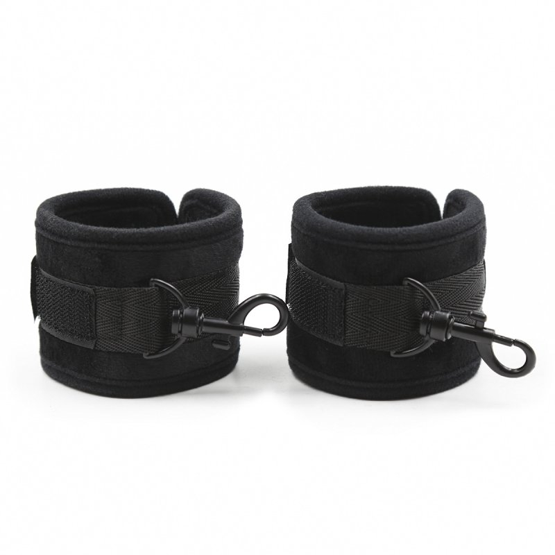 Kit SM comprenant 2 pièces noires : des menottes de poignets, ajustables, de 22.5 cm de long et 6.5 cm de large, à attacher avec des mousquetons et un bandeau à élastique En velours noir avec nylon.