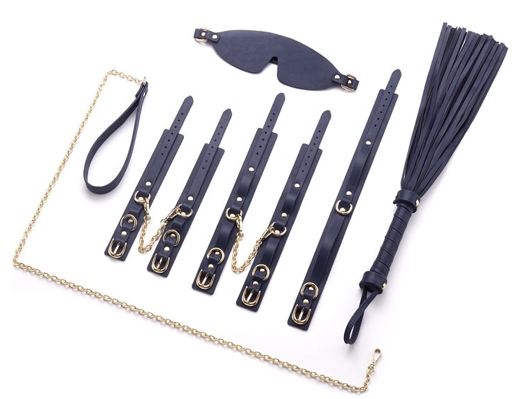 Kit SM comprenant : des menottes de poignets des menottes de chevilles un collier-laisse un martinet et un masque En simili bleu foncé et métal doré.