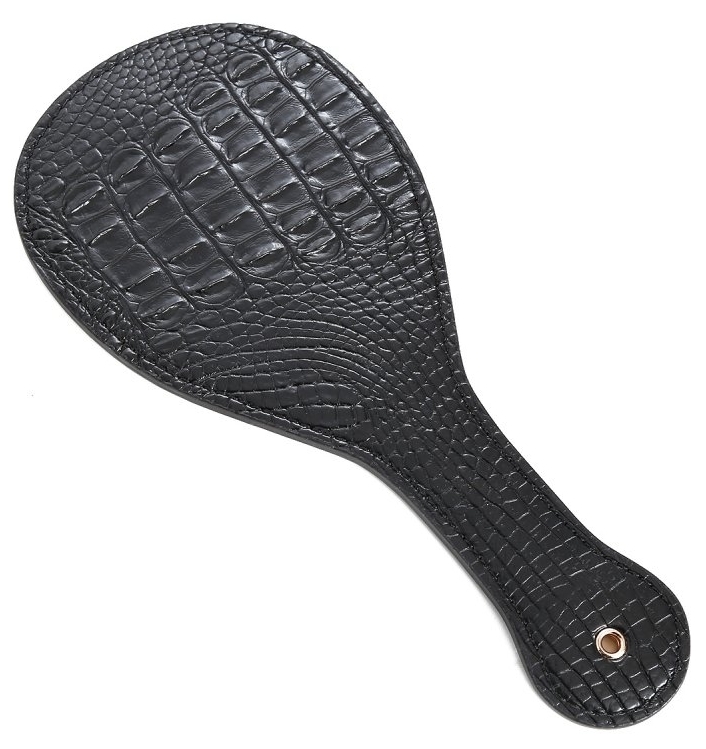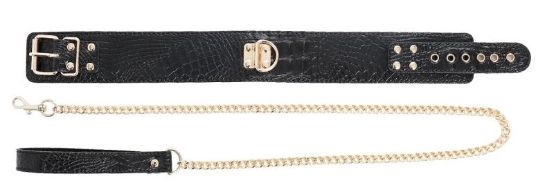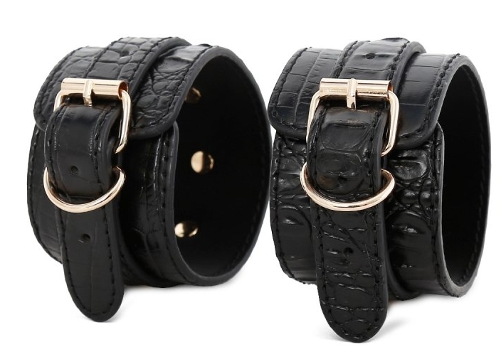 Kit SM 4 Pièces comprenant : des menottes de poignets des menottes de chevilles un collier-laisse et un paddle large En simili noir, motif crocodile et métal doré