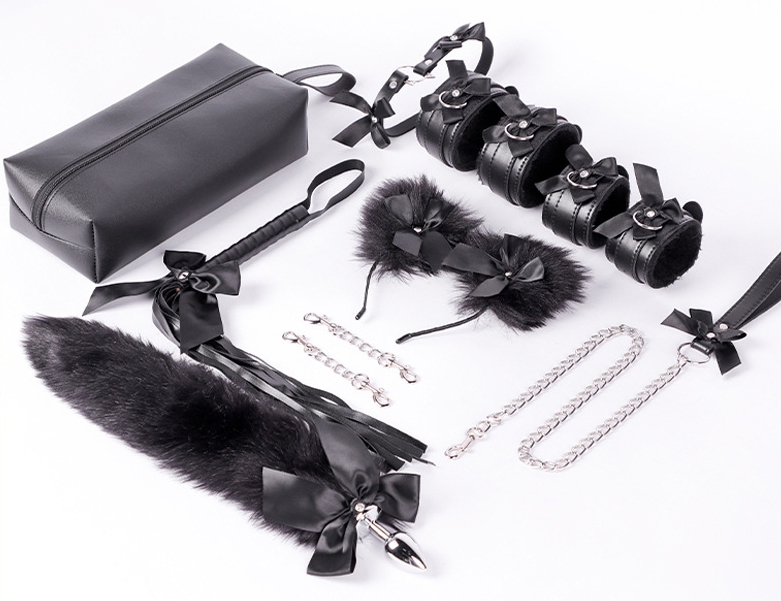 Ce kit Bow suit est composé de : un plug de 6 x 2.7cm avec une queue fourrure un serre-tête avec oreilles et petits noeuds un collier la laisse en métal les menottes de poignets les menottes pour les chevilles un martinet. Chaque accessoire comporte des noeuds. Avec la sacoche de rangement