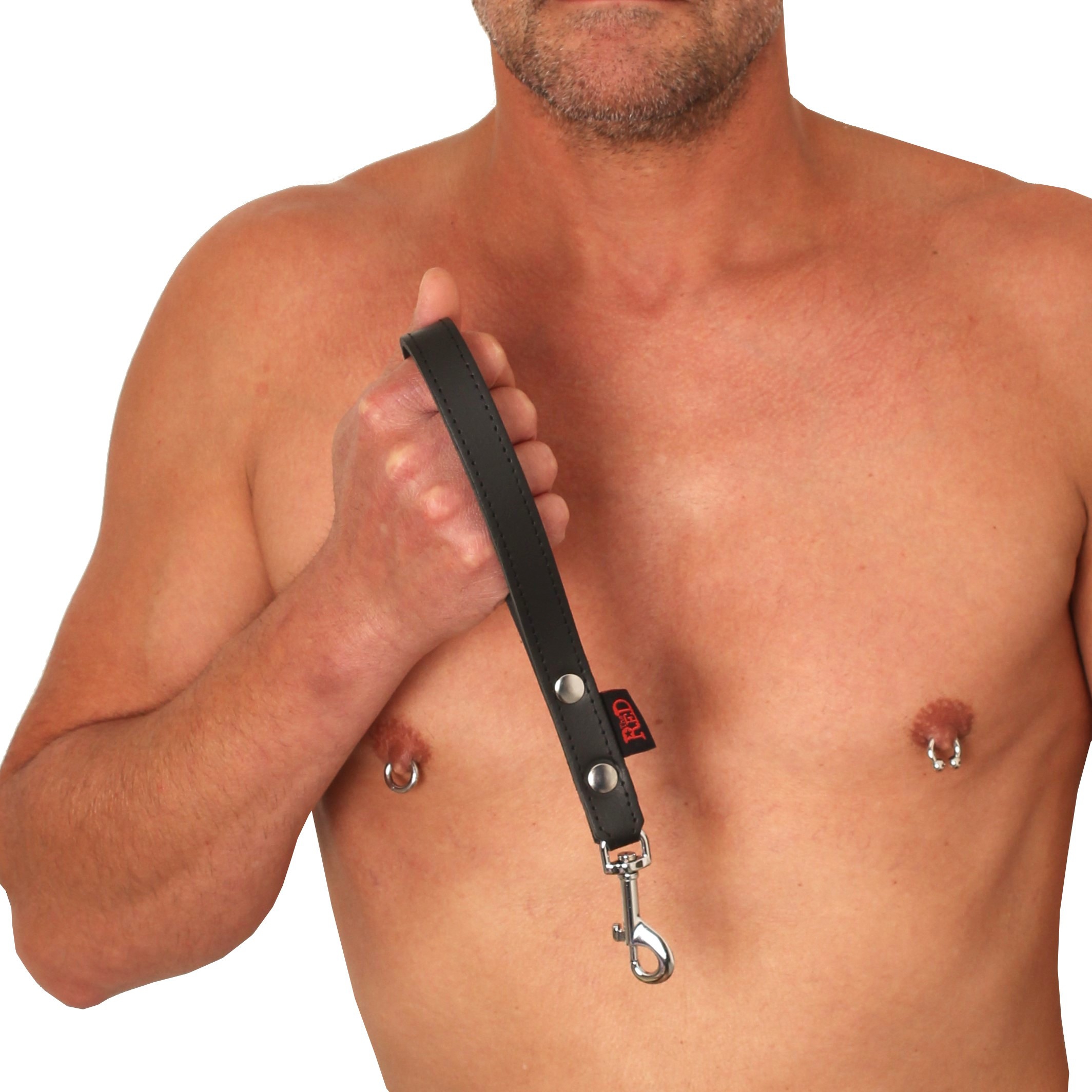 Laisse courte en cuir noir avec mousquetonLongueur totale avec mousqueton : 28cmCuir de haute qualité – Tannage végétalFABRIQUE EN EUROPE