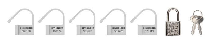 Ce lot est composé de 5 « Locks » numérotés pour fermer les cages de chasteté.Ils permettent de vérifier que la cage n’est pas ouvert et que le partenaire soumis n’a pas triché