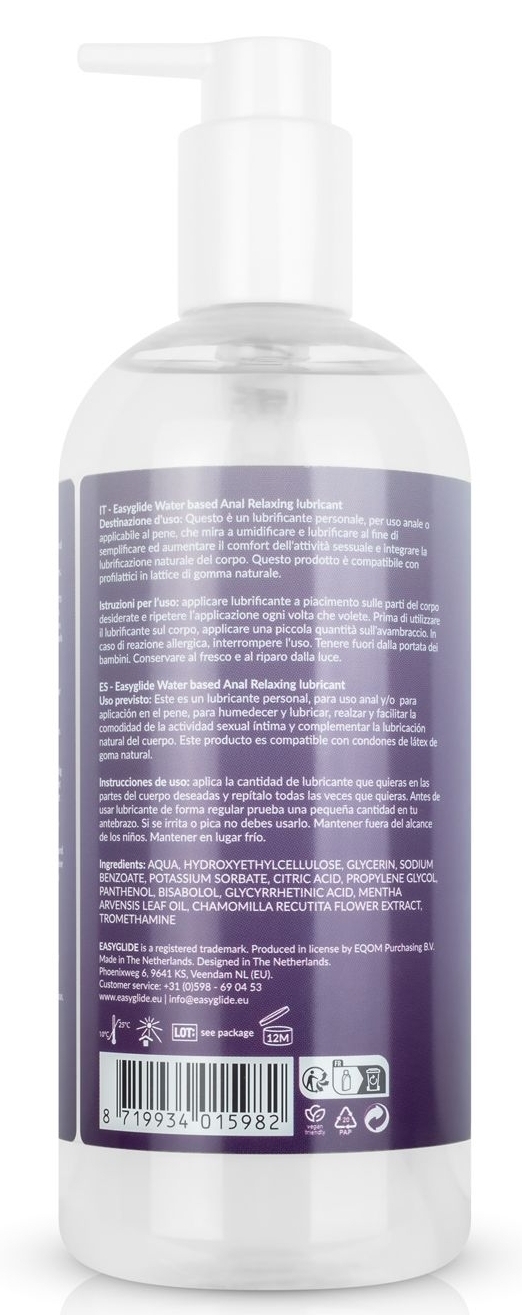 Précautions d’utilisation: Conserver dans un endroit sec et à l’abri de la lumière Garder hors de portée des enfants Eviter le contact avec les yeux, la peau abimée et les plaies. En cas d’irritations, arrêter l’usage et de consulter un médecin si cela persiste Tester sur une petite surface. En cas de rougeurs, allergies ou gênes, ne pas utiliser Ce lubrifiant n’est pas un contraceptif. Il ne contient pas de spermicide Ne pas avaler Ingredients : aqua, hydroxyethylcellulose, glycerin, sodium benzoate, potassium sorbate, citric acid, propylene glycol, panthenol, bisabolol, glycyrrhetinic acid, mentha arvensis leaf oil, chamomilla recutita flower extract, tromethamine.